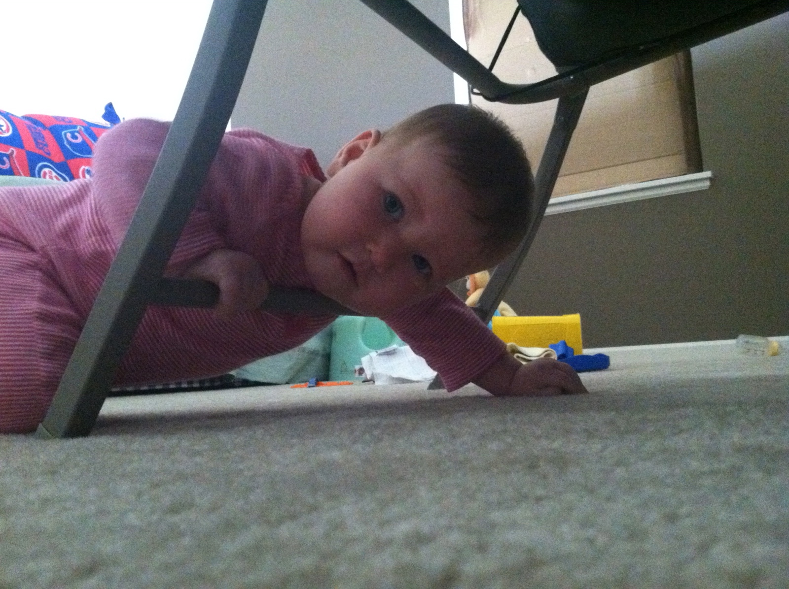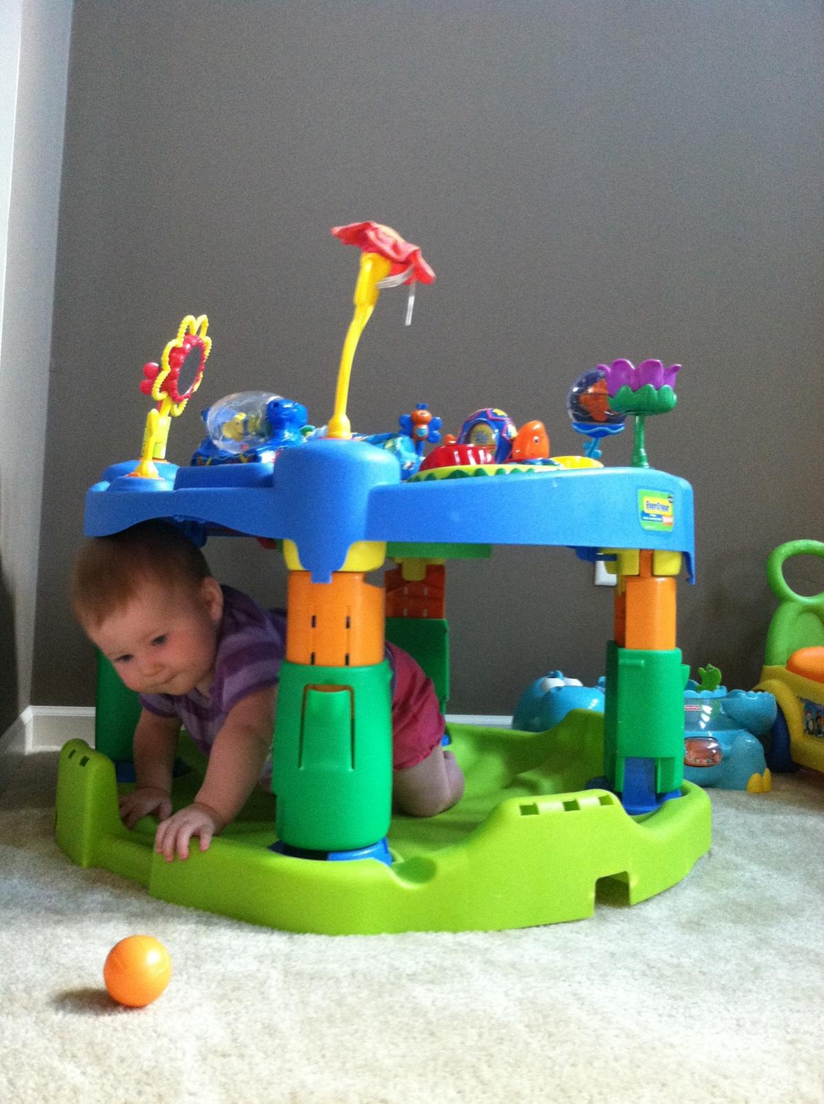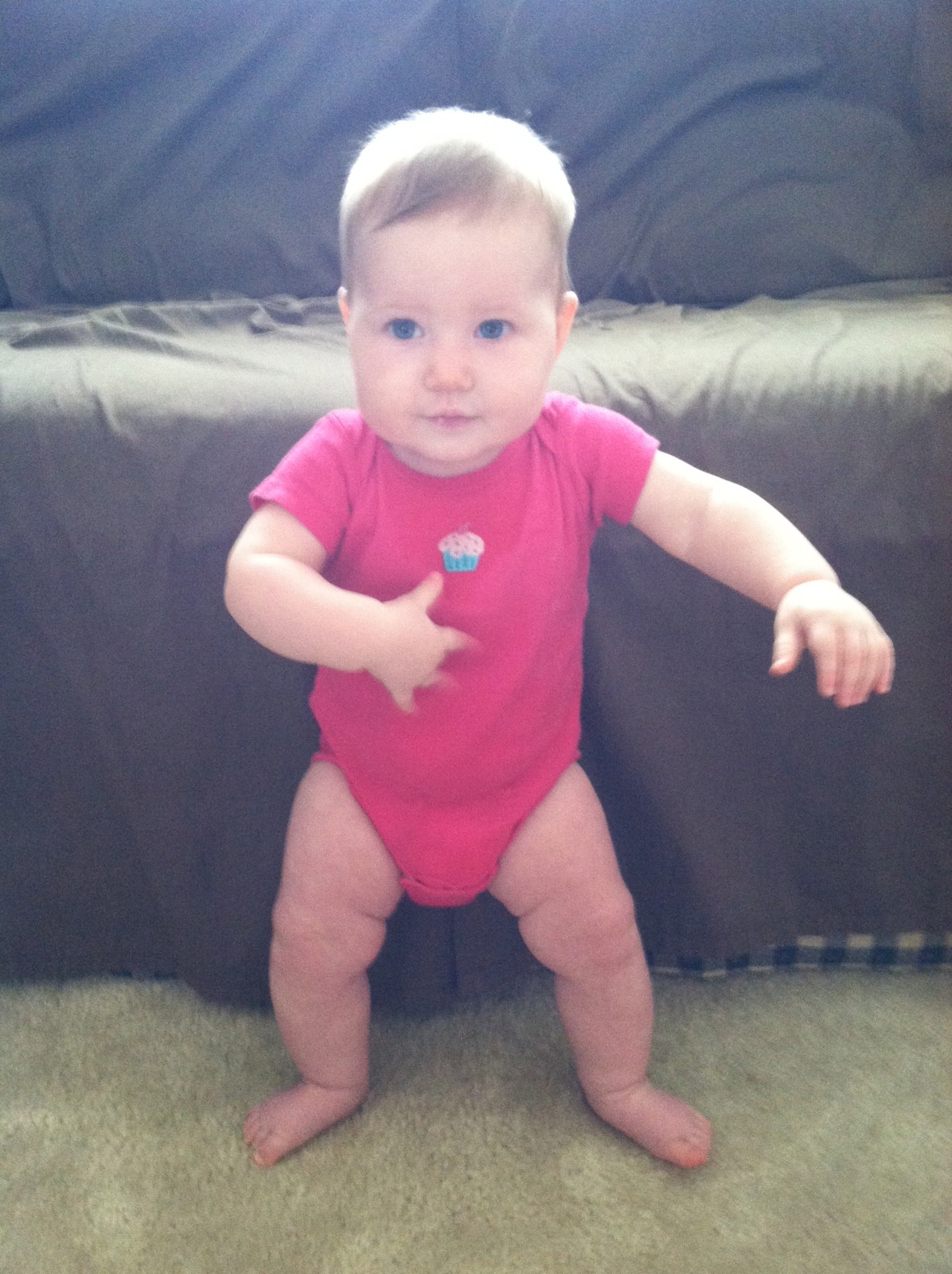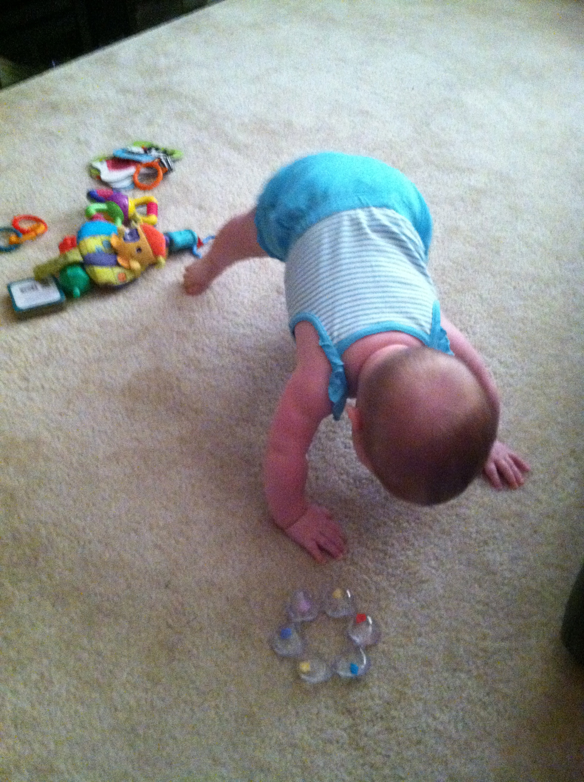 While crawling, you like to hold onto items like socks, nail clipper, stuffed animals etc…You have stealth vision for unraveled carpet pieces. I have no idea how you find them, but you will spot them from across the room and B-line over to it and pop it into your mouth. By the end of the month you were also following traffic patterns when crawling. When you first started you would crawl in a straight line, even if it meant going under tables and chairs. Now, you’ll crawl around the dinning room table in the same way we walk around it. Again, I love watching you react to your brain development. It is so interesting.