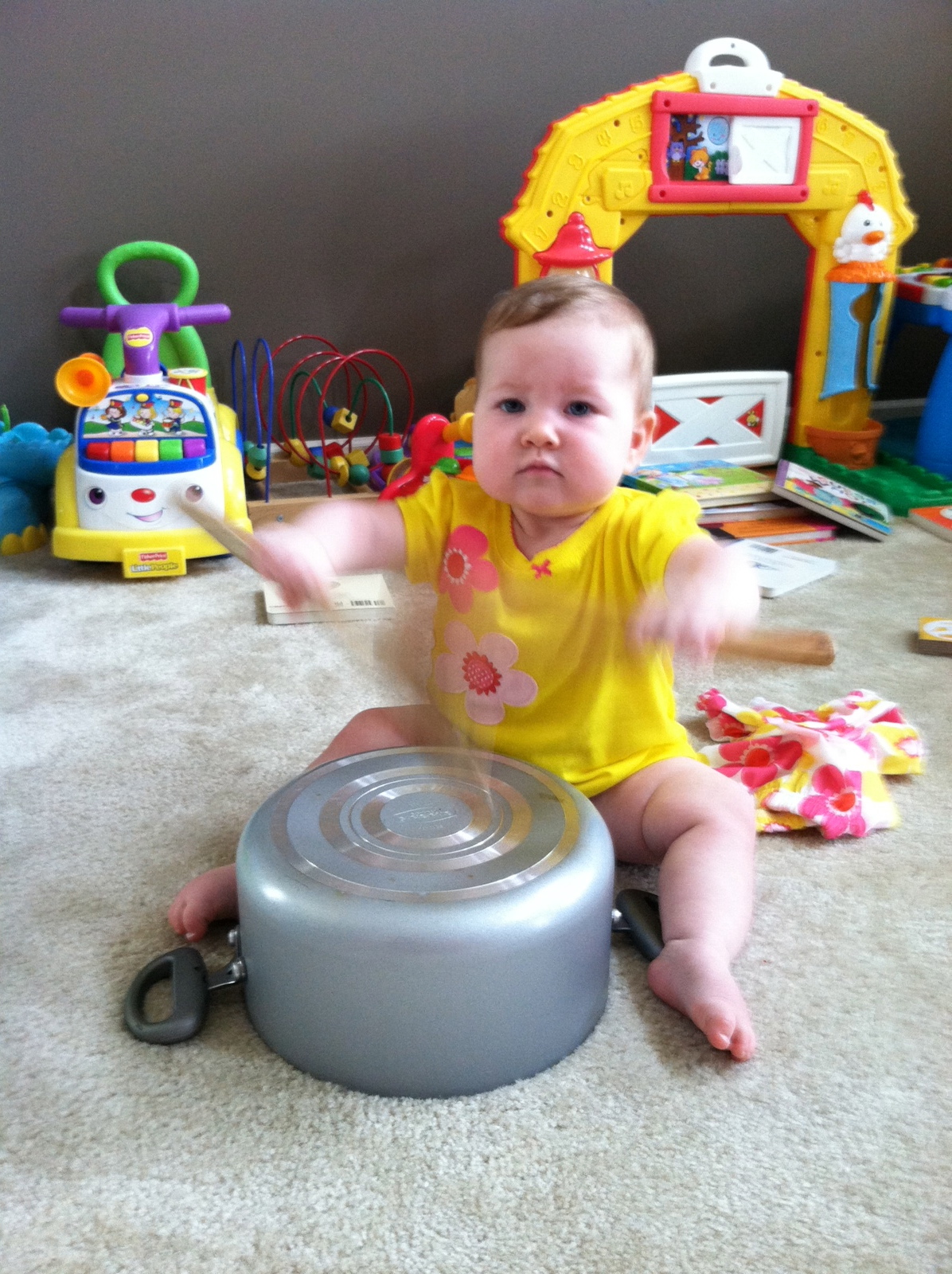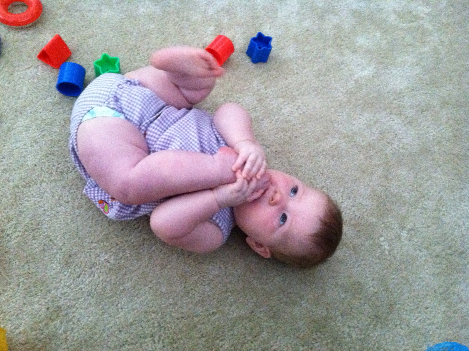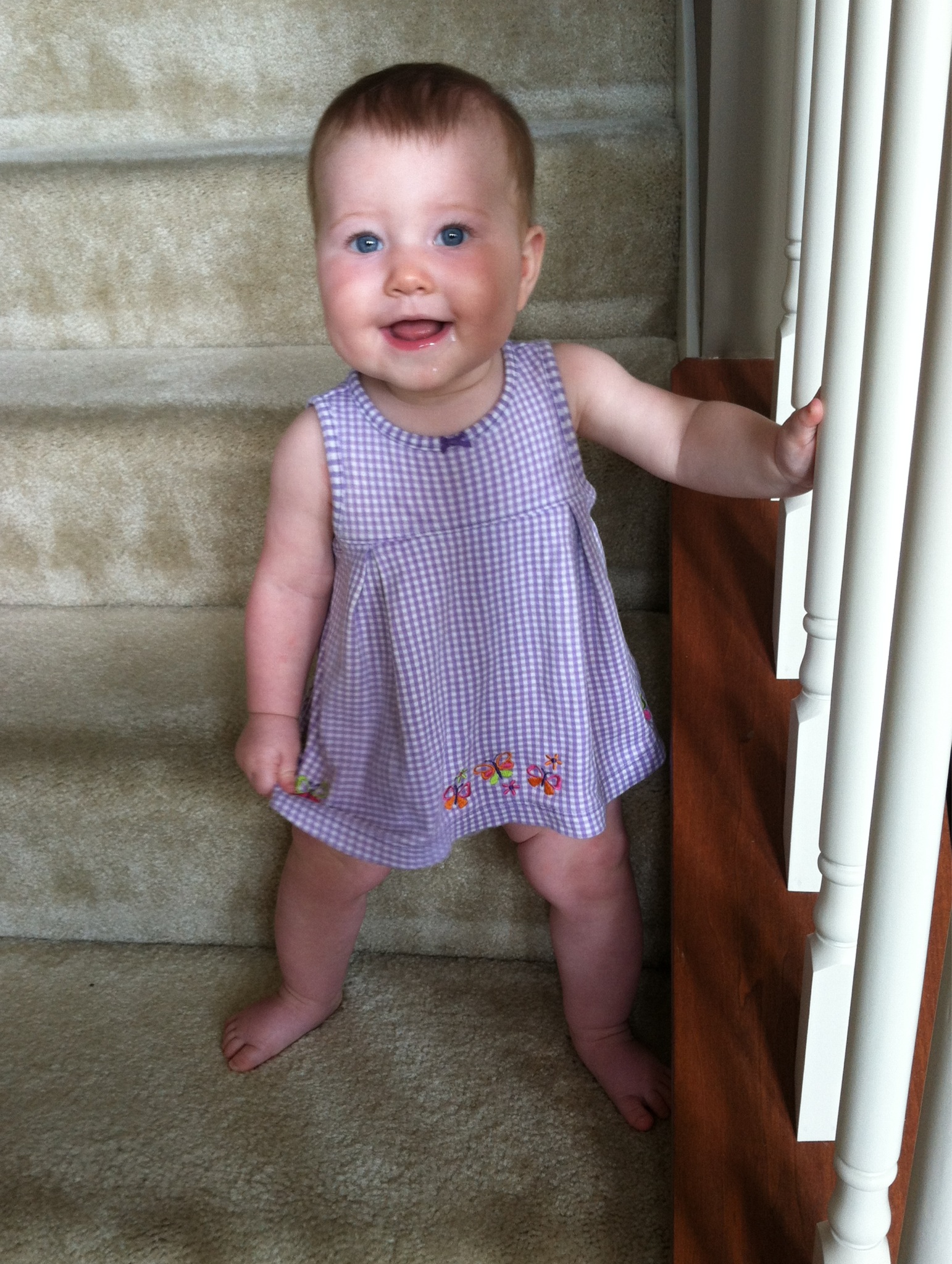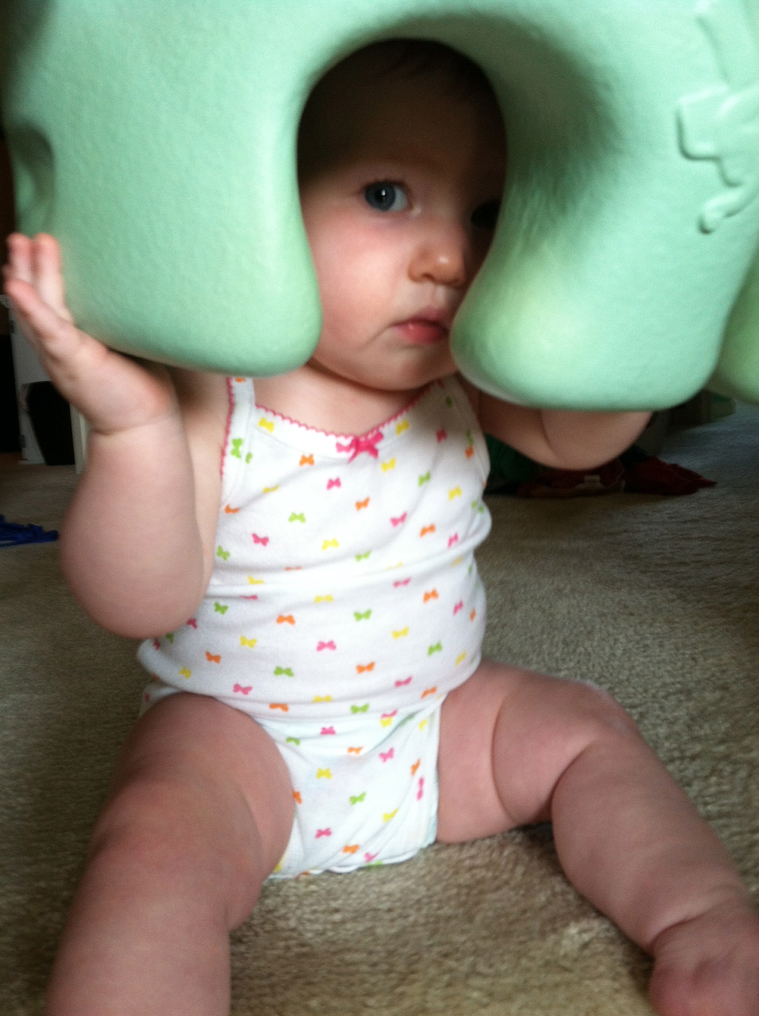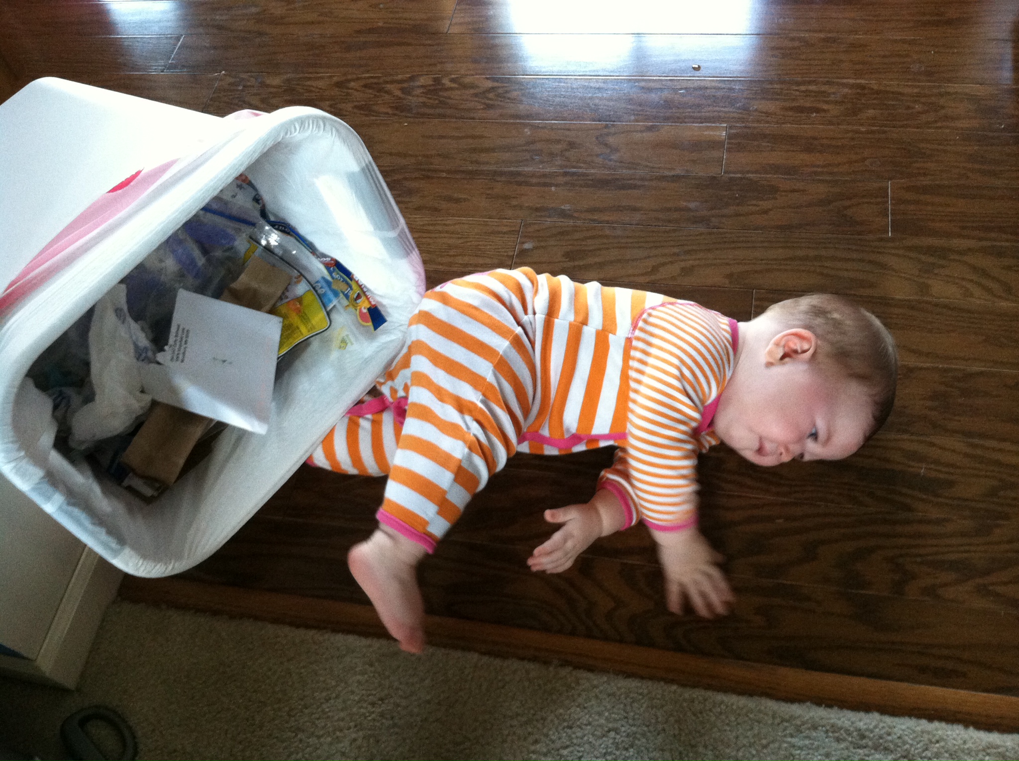 While crawling, you like to hold onto items like socks, nail clipper, stuffed animals etc…You have stealth vision for unraveled carpet pieces. I have no idea how you find them, but you will spot them from across the room and B-line over to it and pop it into your mouth. By the end of the month you were also following traffic patterns when crawling. When you first started you would crawl in a straight line, even if it meant going under tables and chairs. Now, you’ll crawl around the dinning room table in the same way we walk around it. Again, I love watching you react to your brain development. It is so interesting.