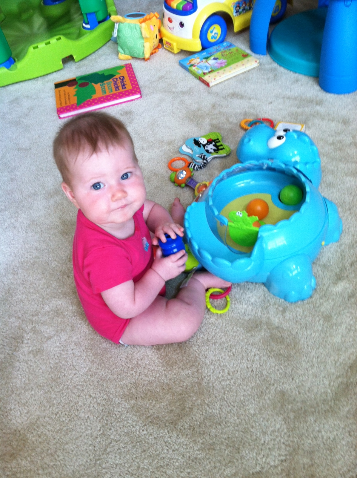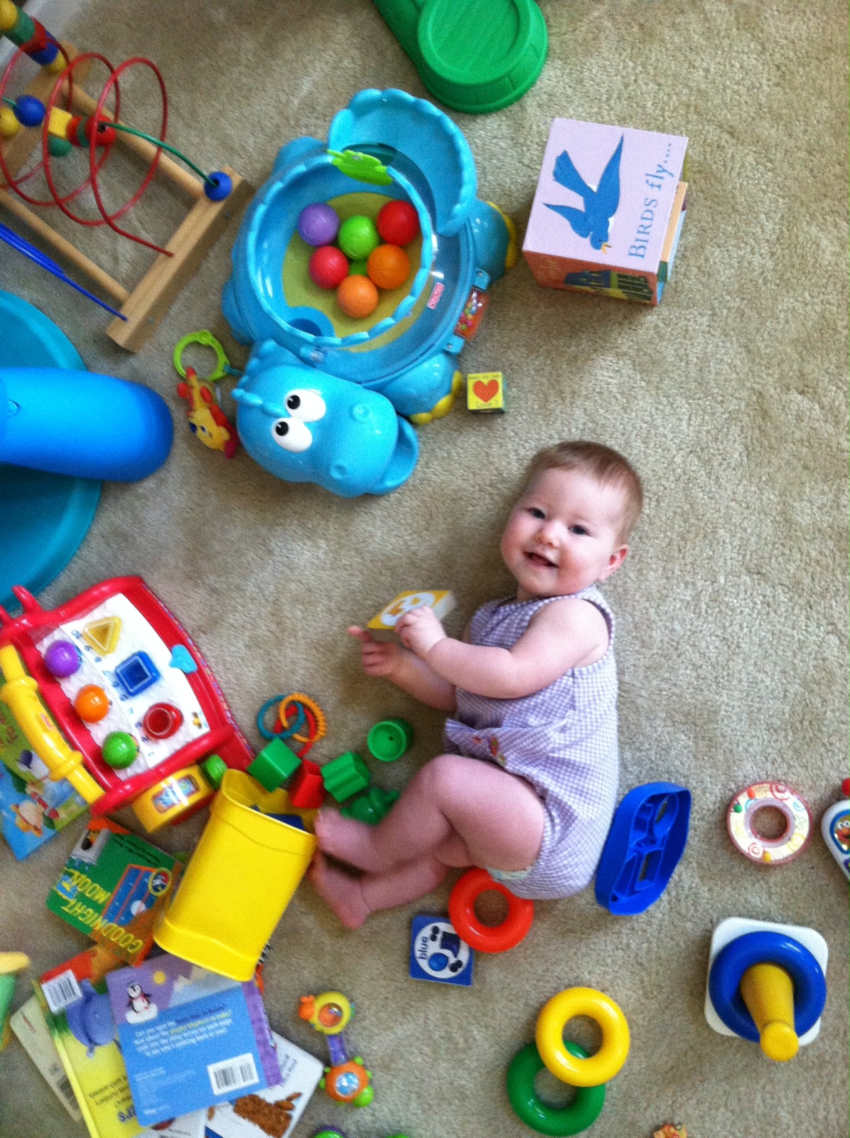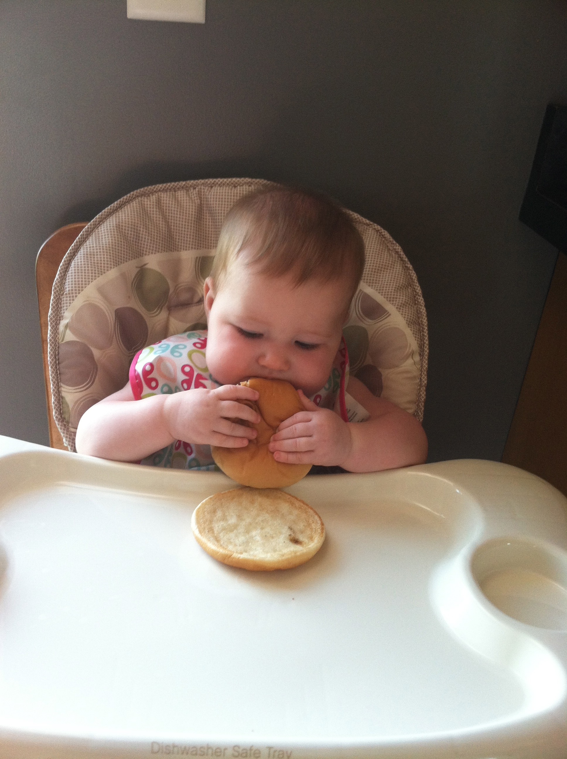 You continue to be terrific eater and have added many new items to your menu including: Cheerios, Gerber Puffs, grapes, watermelon, potatoes, cheese, frosted animal crackers and McDonald’s. I bought a McDonald’s hamburger for you and put the whole thing in front of you to see what you would do. Sure enough you picked the whole thing up and brought it to your mouth just like we do, which was hilarious because it is almost half the size of your head. On average you nurse/have bottles five times a day with each one being about six ounces, except for your morning feeding which is about eight ounces.
