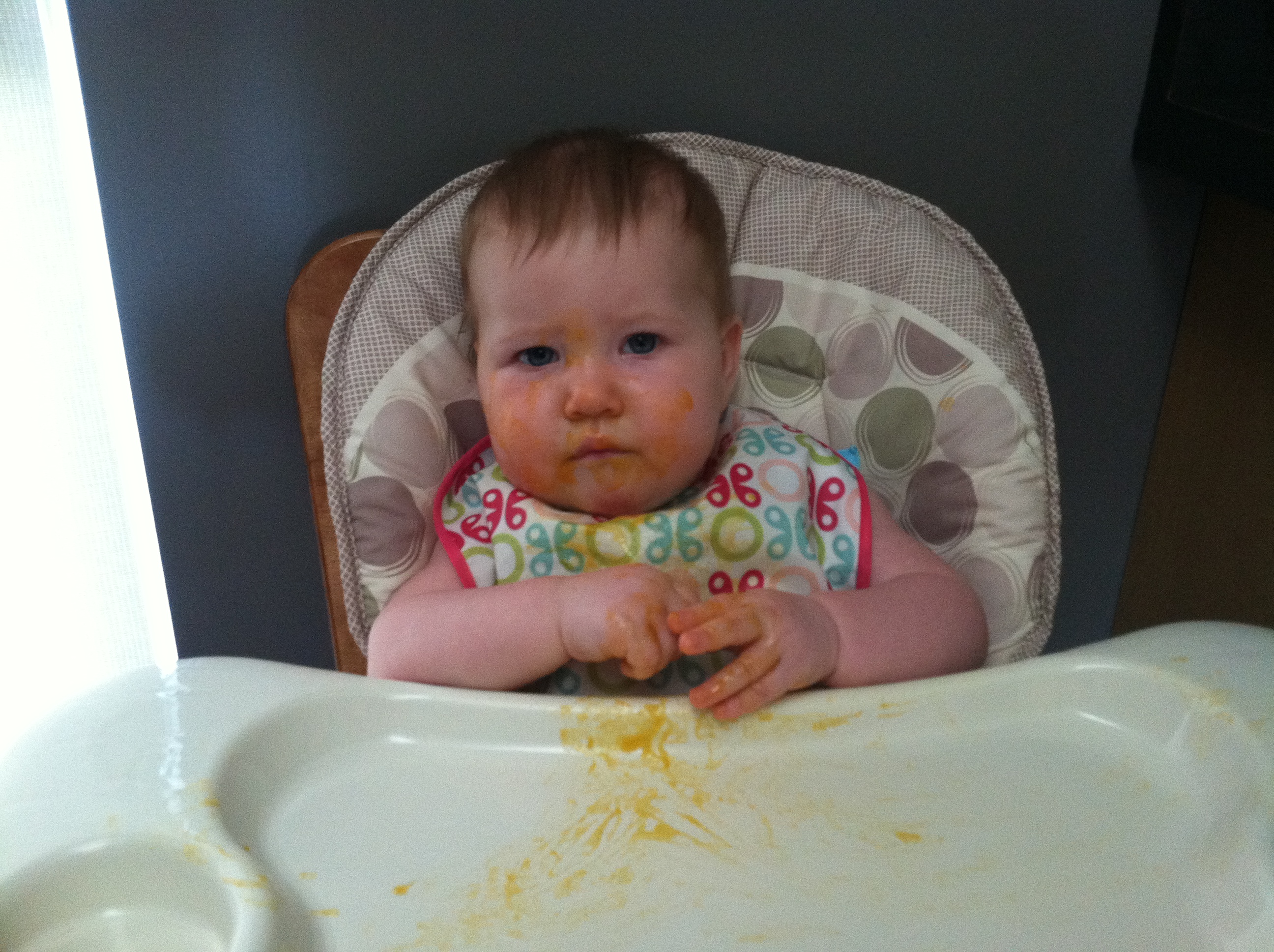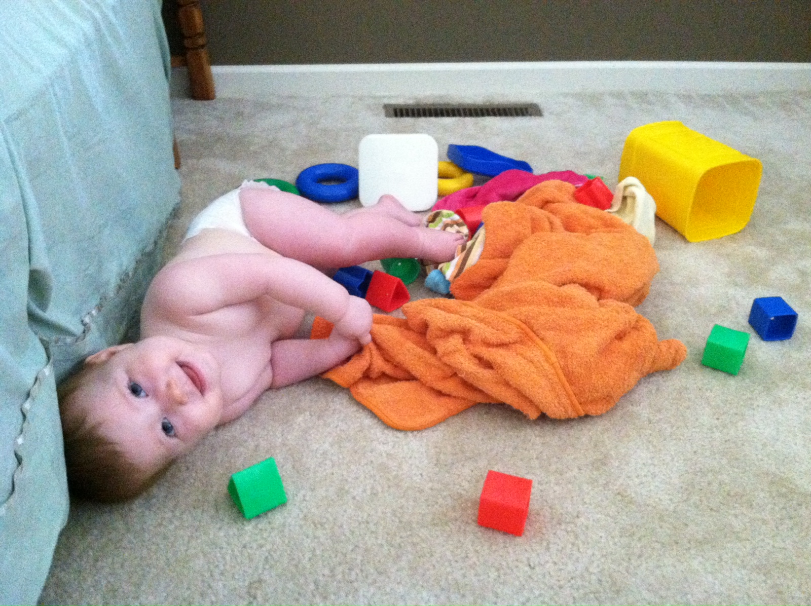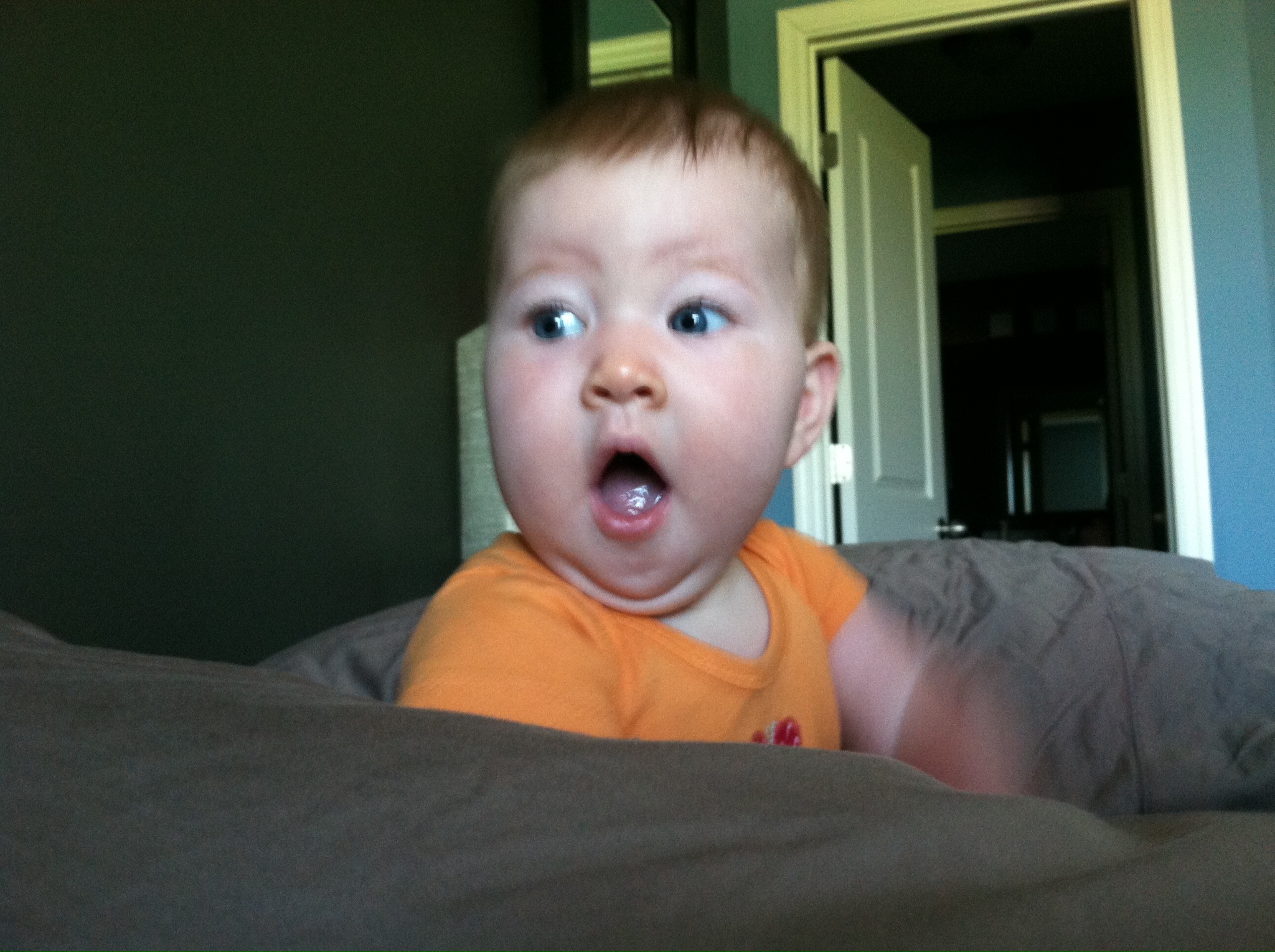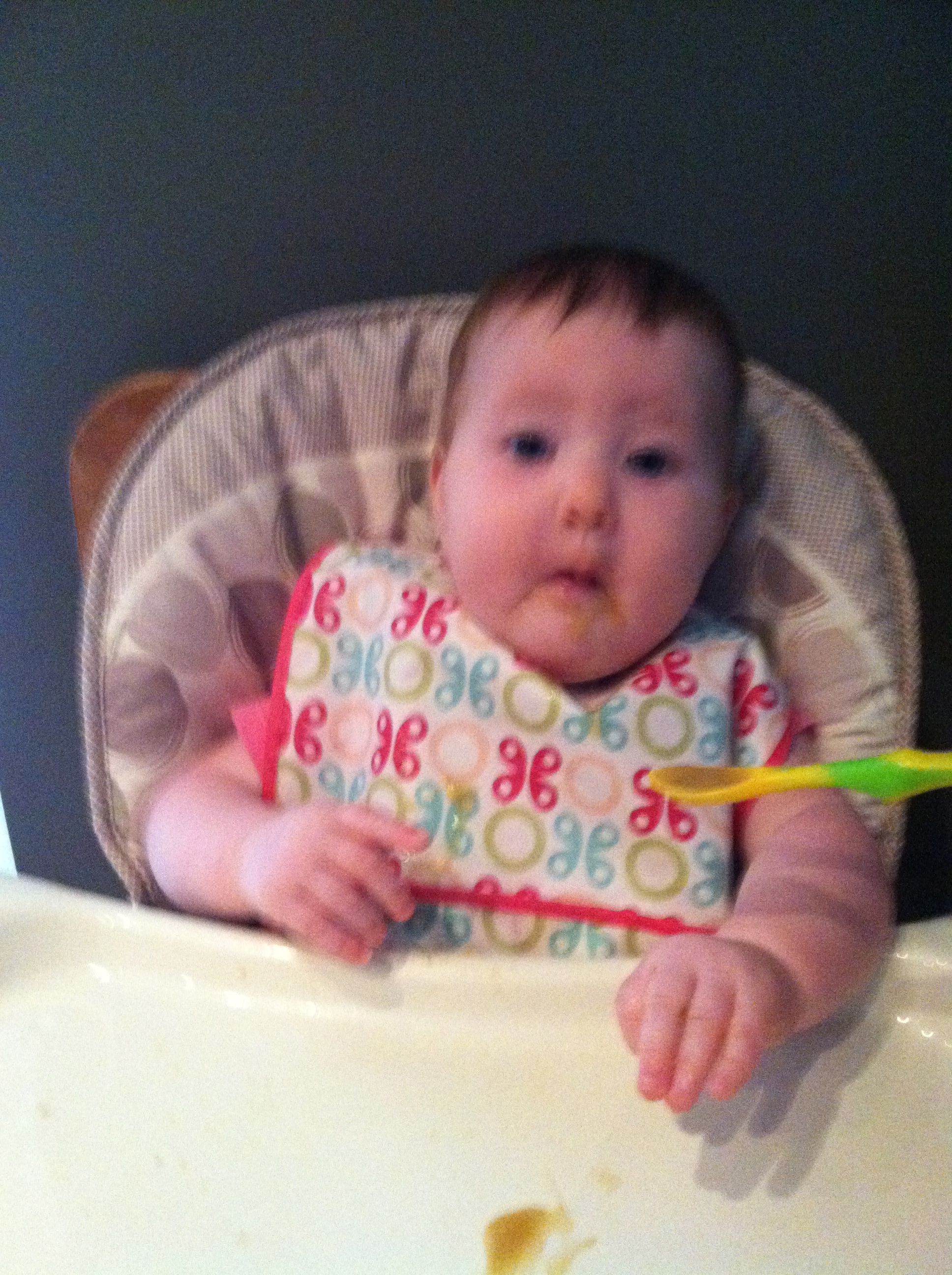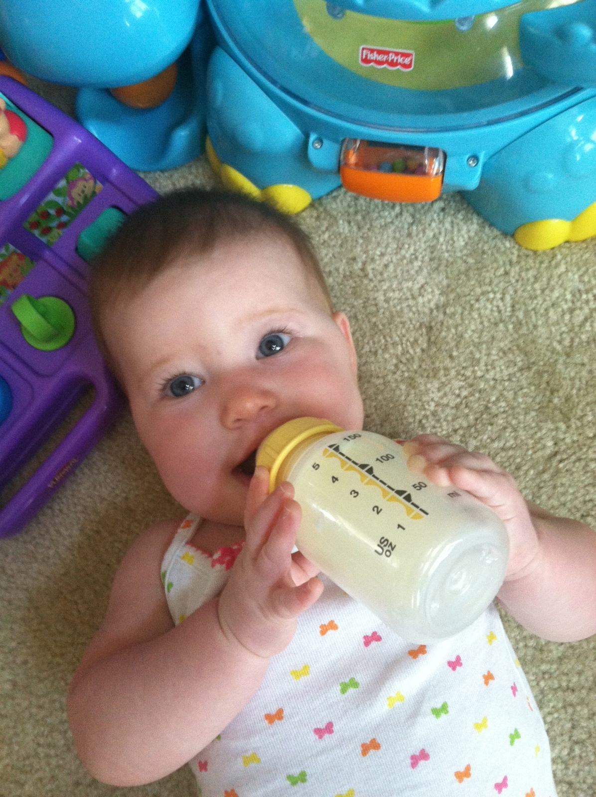 You nap twice a day for about an hour and a half each time. Once around noon and the other time around 4:15. Both times you are put down awake. You usually cry and scuff around in your crib for five minutes and then fall asleep. Occasionally, you wake up between five and six am, eat and go right back to sleep, otherwise you usually wake up between 7:30 and 8:30 am. Each night, you go to bed around 9. About half the time you’ll fall asleep nursing and the other we’ll put you into your crib awake. One funny pattern we’ve noticed is you typically fall asleep in the bottom corner of your crib laying the short way (opposed to the long way). I’m not sure why, because you move around the whole crib before you ‘get comfortable’ but that is always the spot you end up.