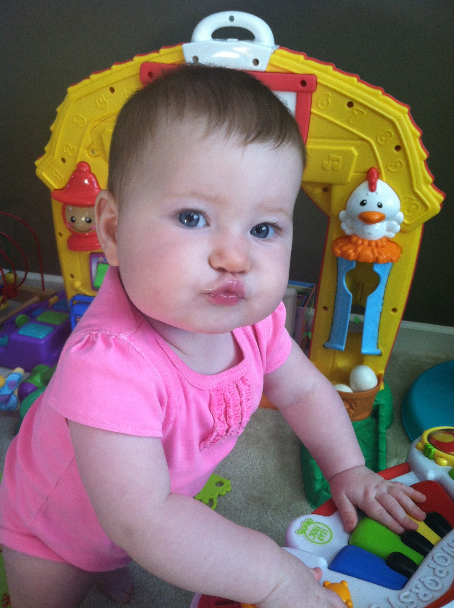 You LOVE LOVE LOVE to make a duck face. You push your top lip up to your nose and stick your bottom lip out, creating a little baby duck bill. And you do it all the time. You do it while you’re eating, crawling, playing with toys and riding in the stroller.