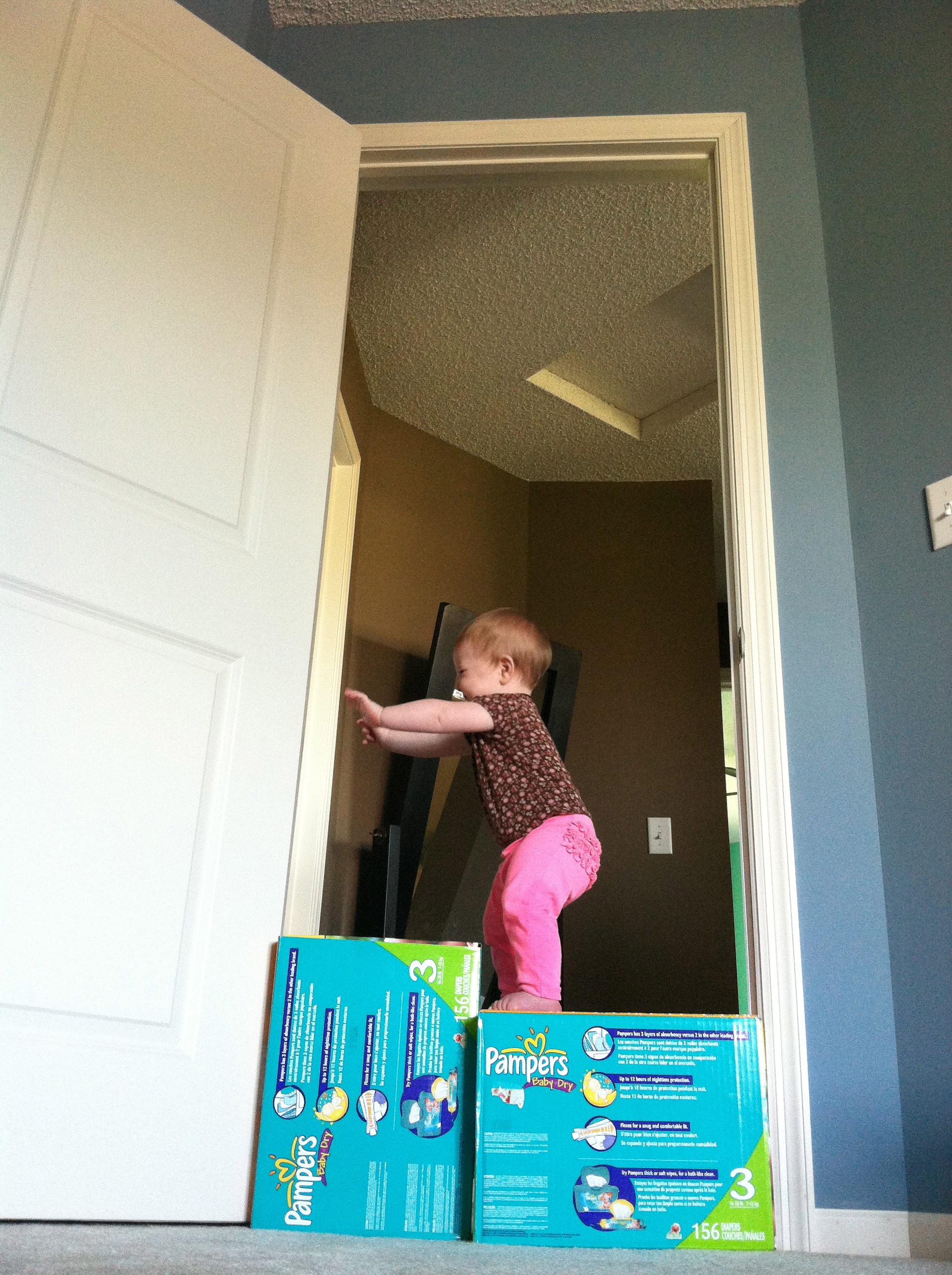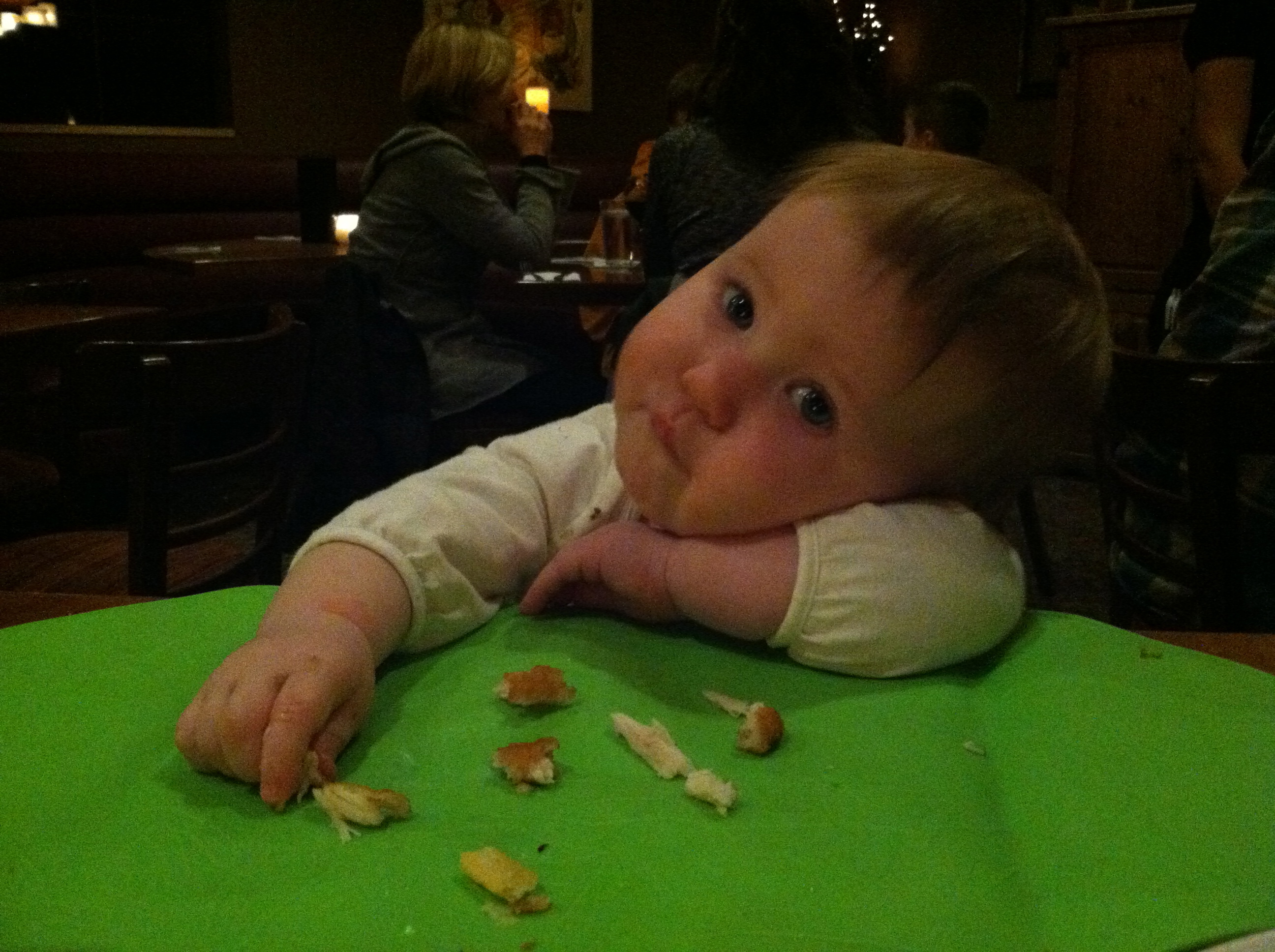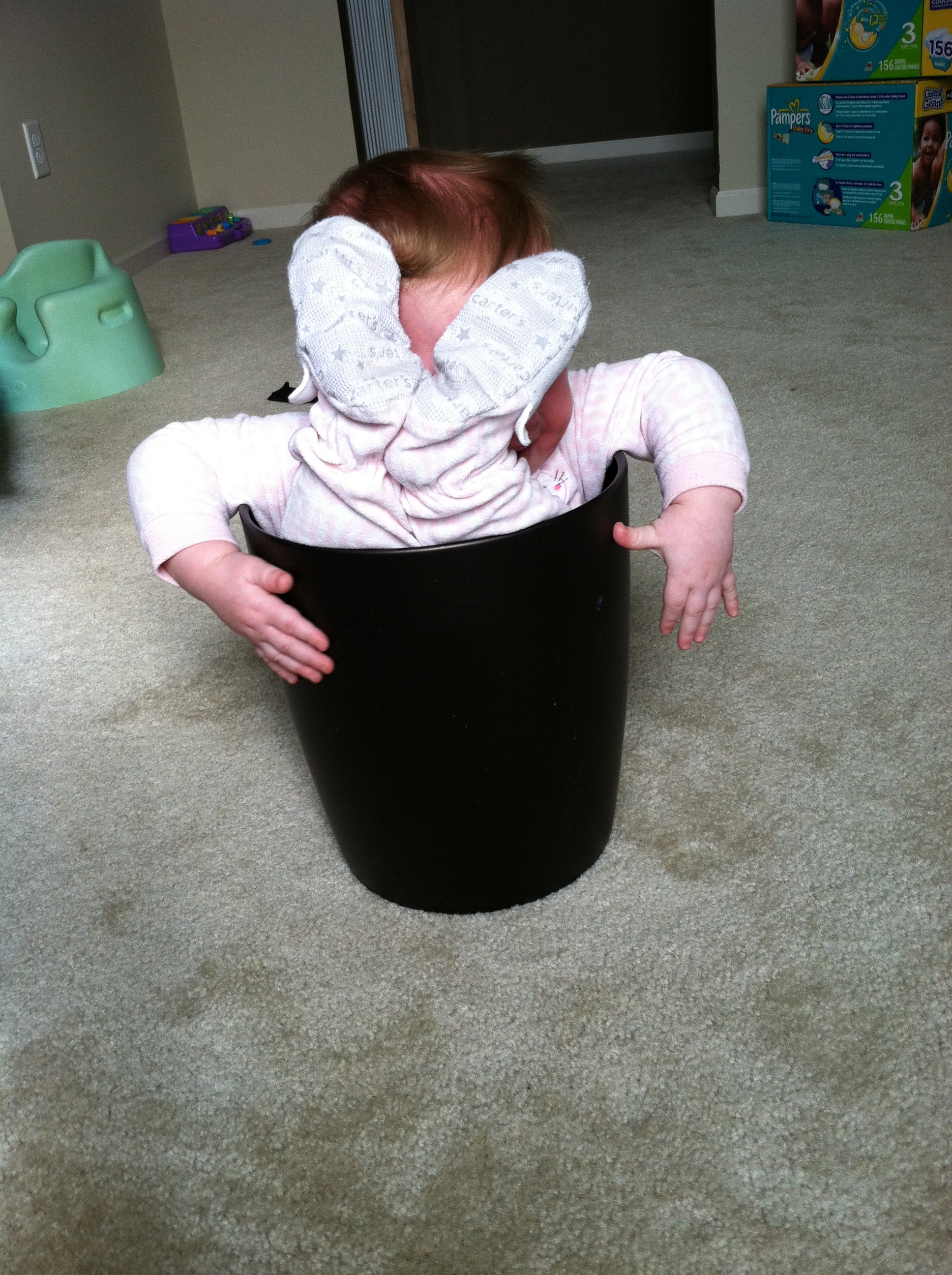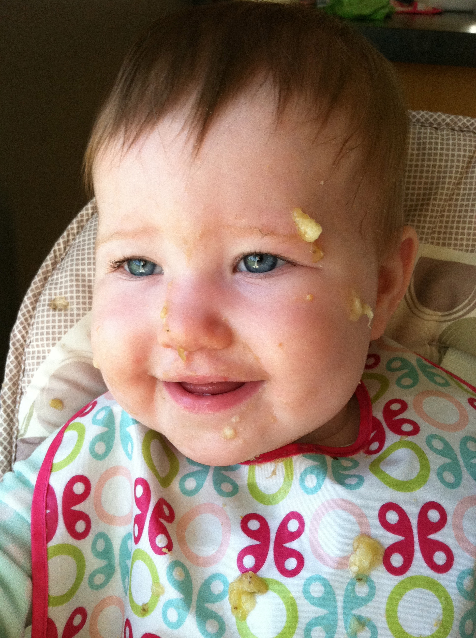 Eating: We think you may have a corn allergy. You get a little rash to the right of your mouth and TERRIBLE diaper rash whenever you have corn as a main ingredient (raw corn, Kixs, corn chips). You’re still at 3 bottles a day, and I am officially done pumping. There is more than enough frozen milk to get you through the month! And as far as table food goes, you’re like a garbage disposal. You eat and eat and eat!