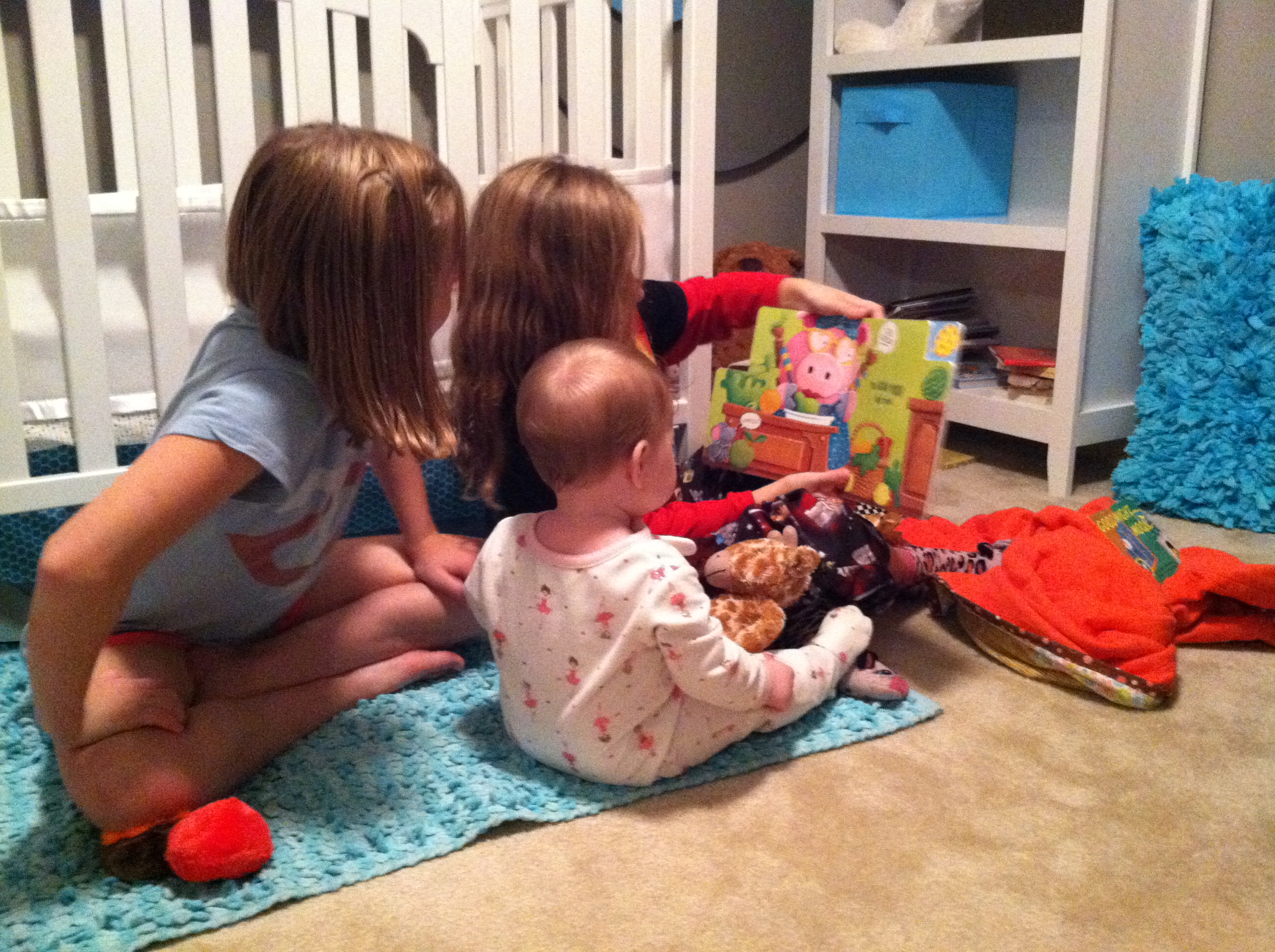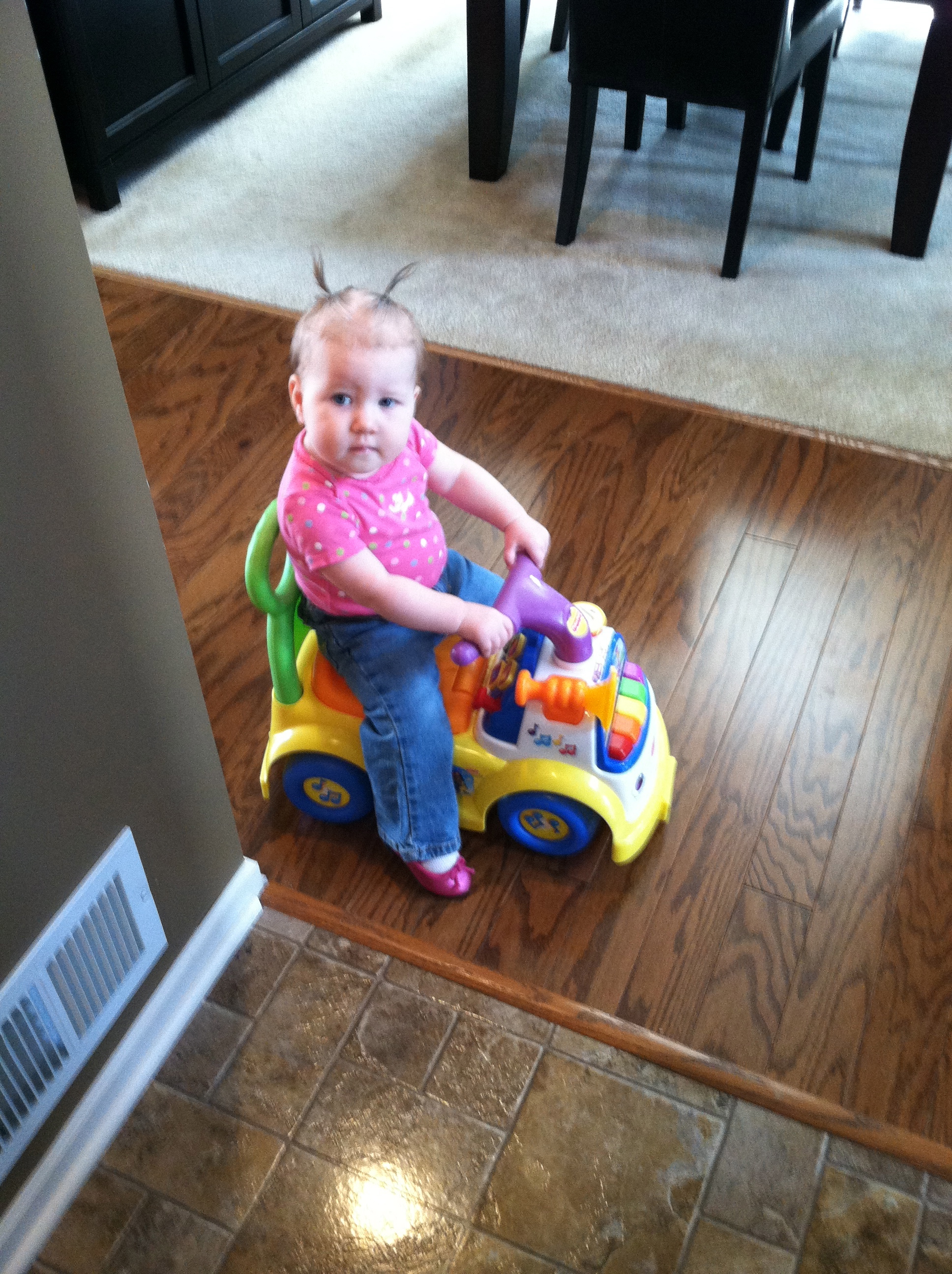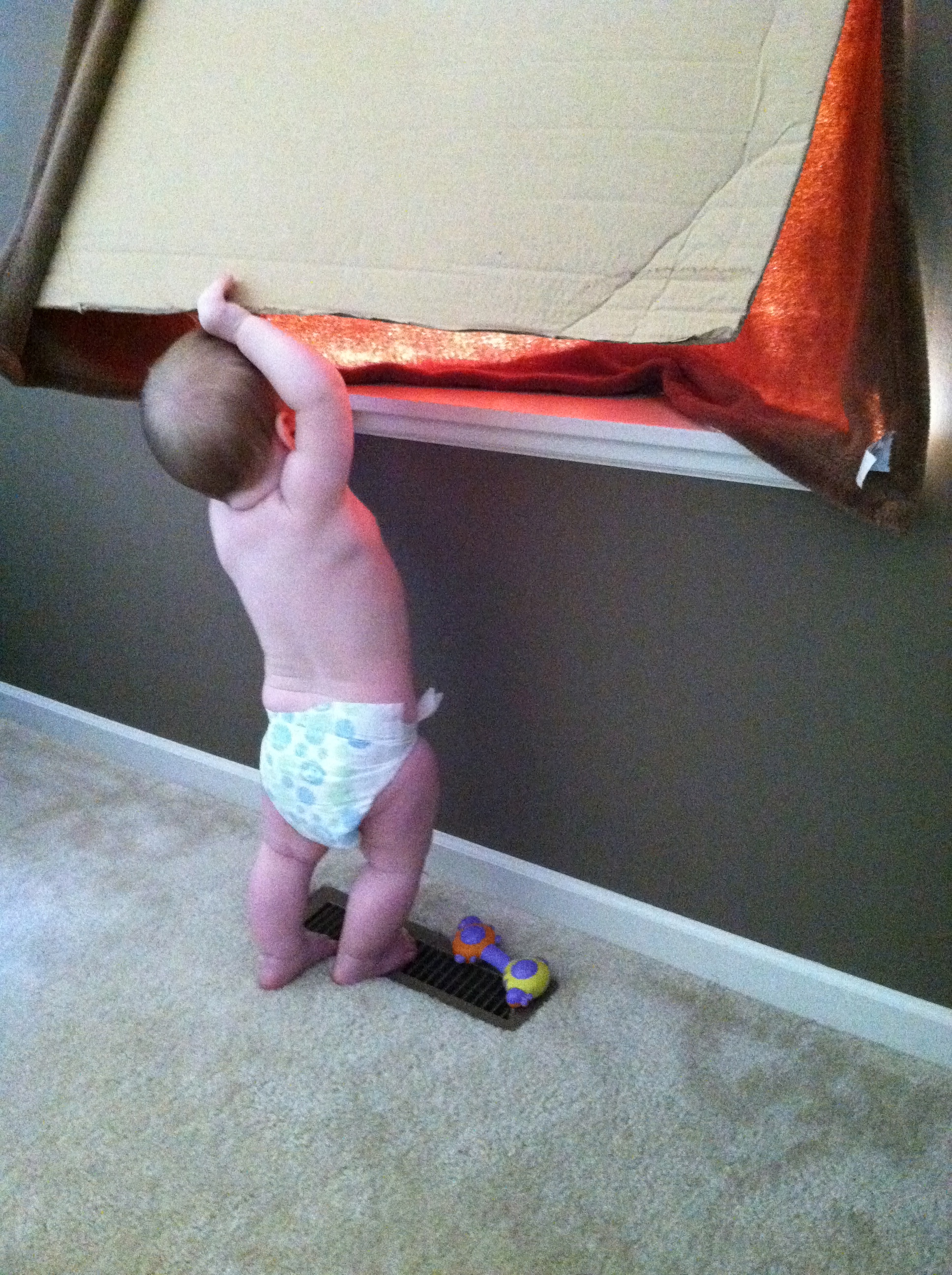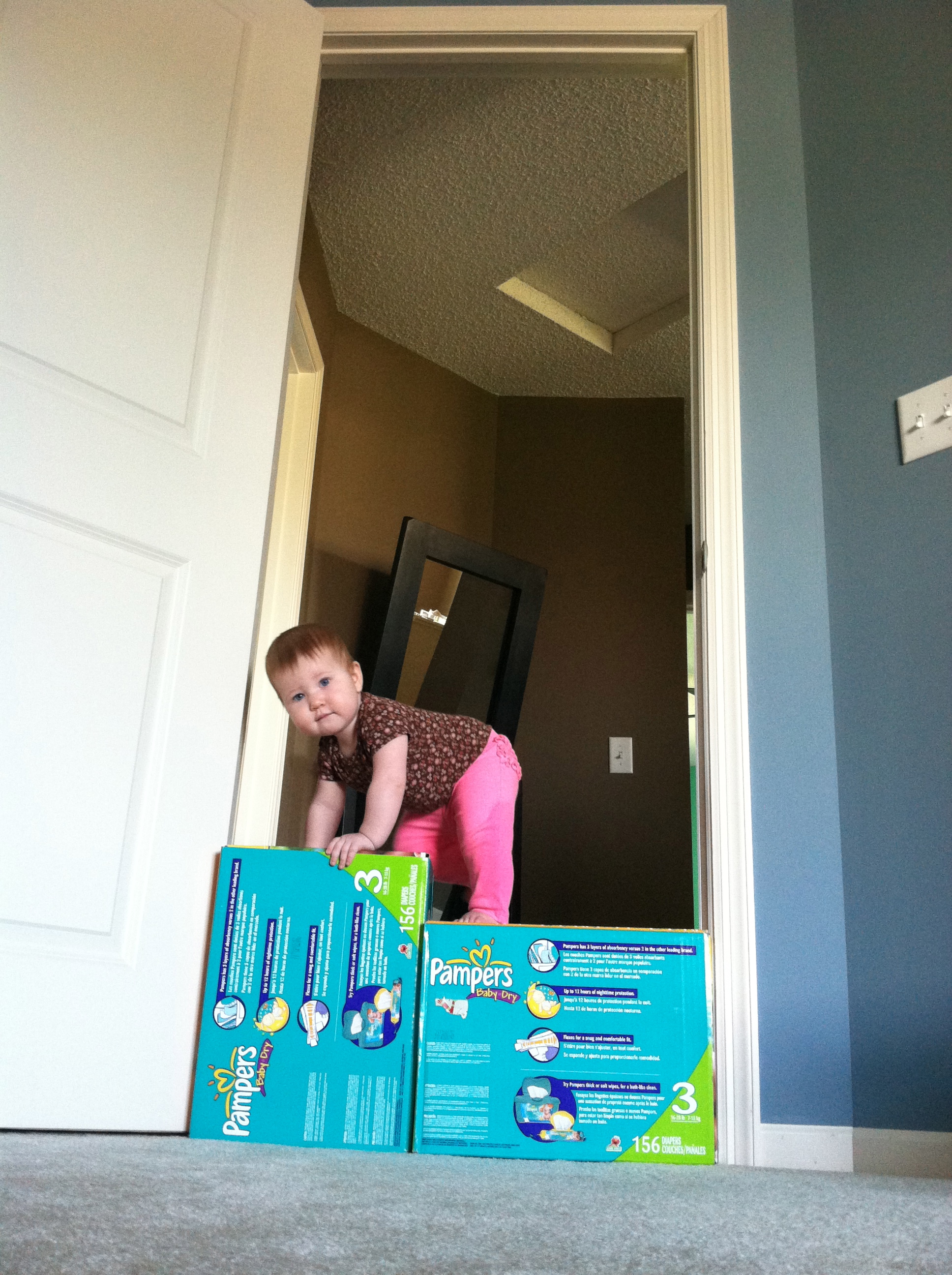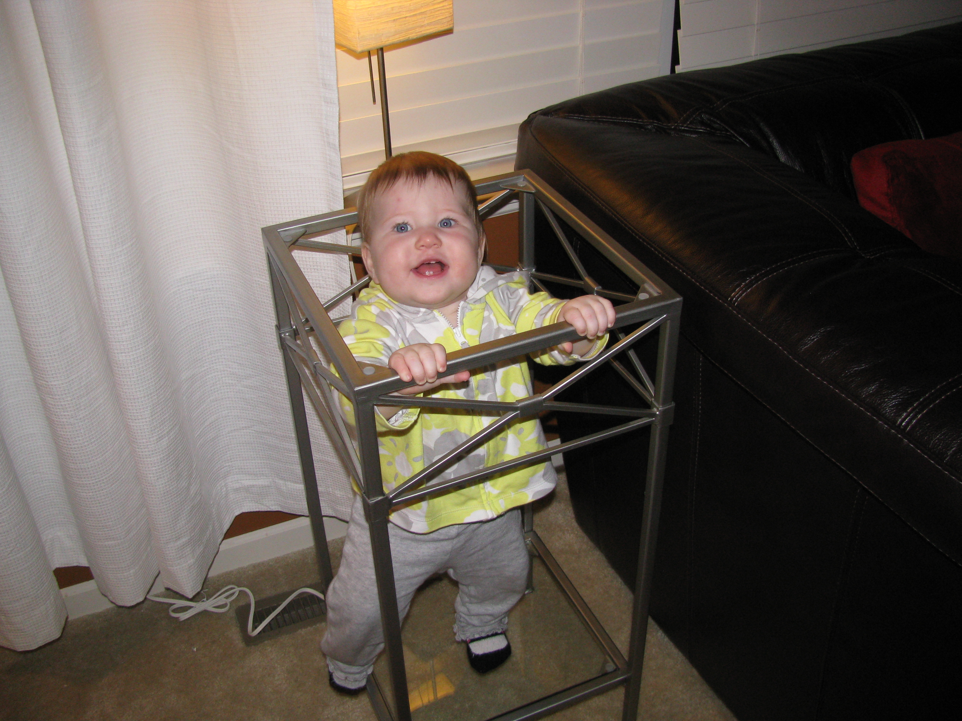 Eating: We think you may have a corn allergy. You get a little rash to the right of your mouth and TERRIBLE diaper rash whenever you have corn as a main ingredient (raw corn, Kixs, corn chips). You’re still at 3 bottles a day, and I am officially done pumping. There is more than enough frozen milk to get you through the month! And as far as table food goes, you’re like a garbage disposal. You eat and eat and eat!