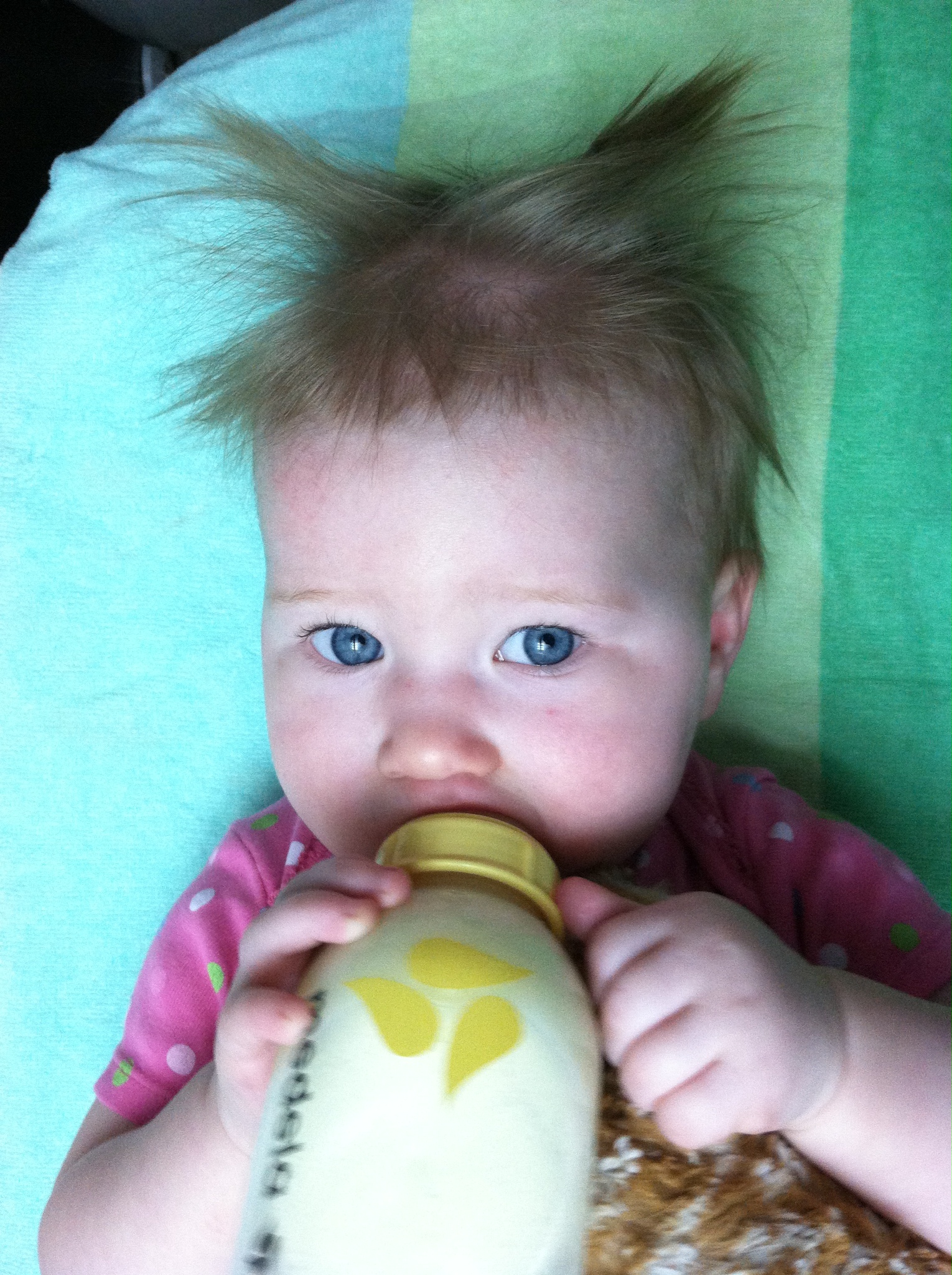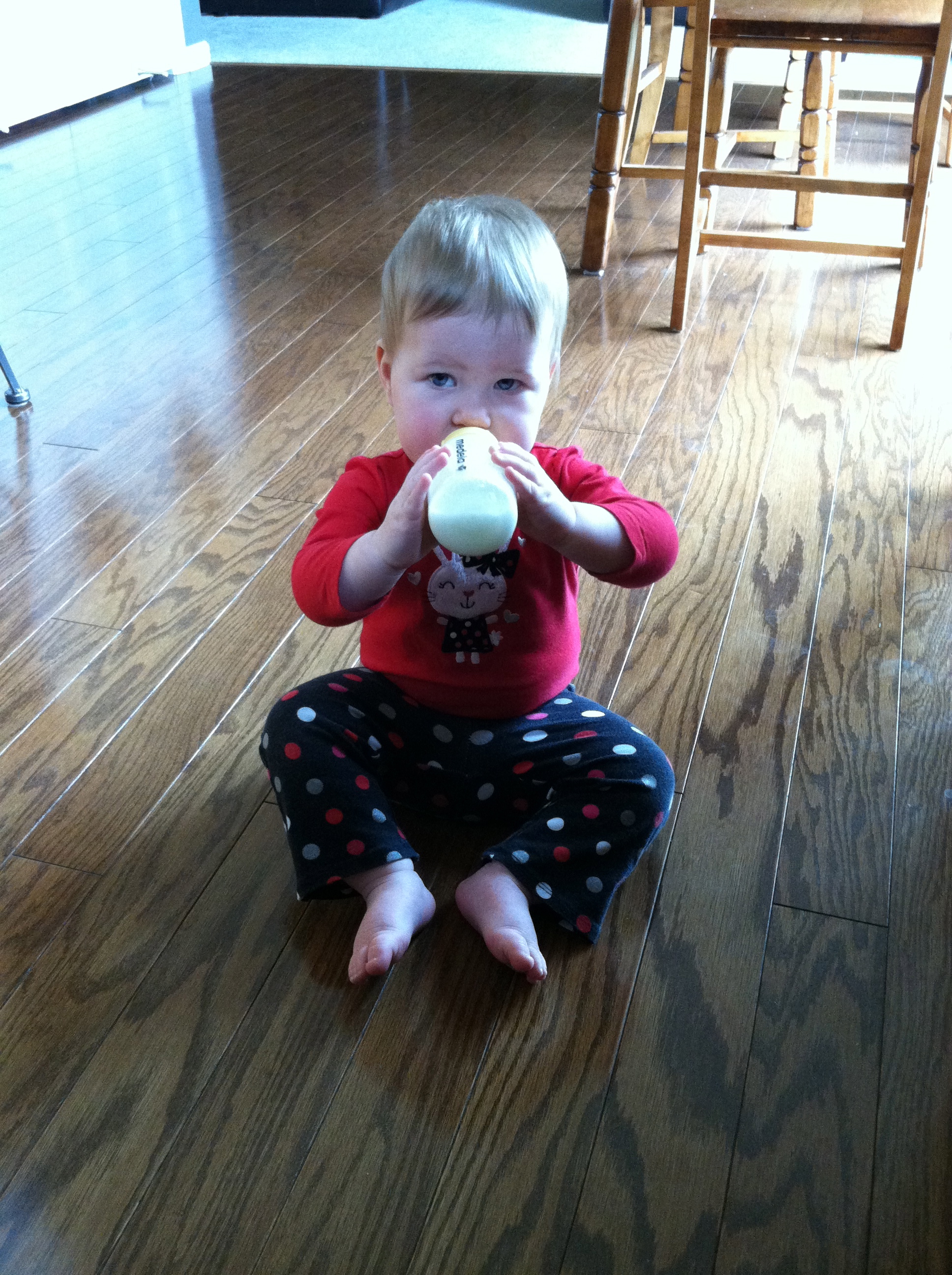 You’ve been holding your own bottle for months now, but it is so darn sweet to see your little hands grip it and hold it near the top as you gulp away. Daddy also says you look for your bottle each morning when he takes you out of your crib. I always put your bottle on the ledge near the stairs so it is ready. When you wake up Daddy gets you from your crib and then gets the bottle with you. If he goes into our bedroom or is blocking your view of it, you squirm around in his arms trying to see it.