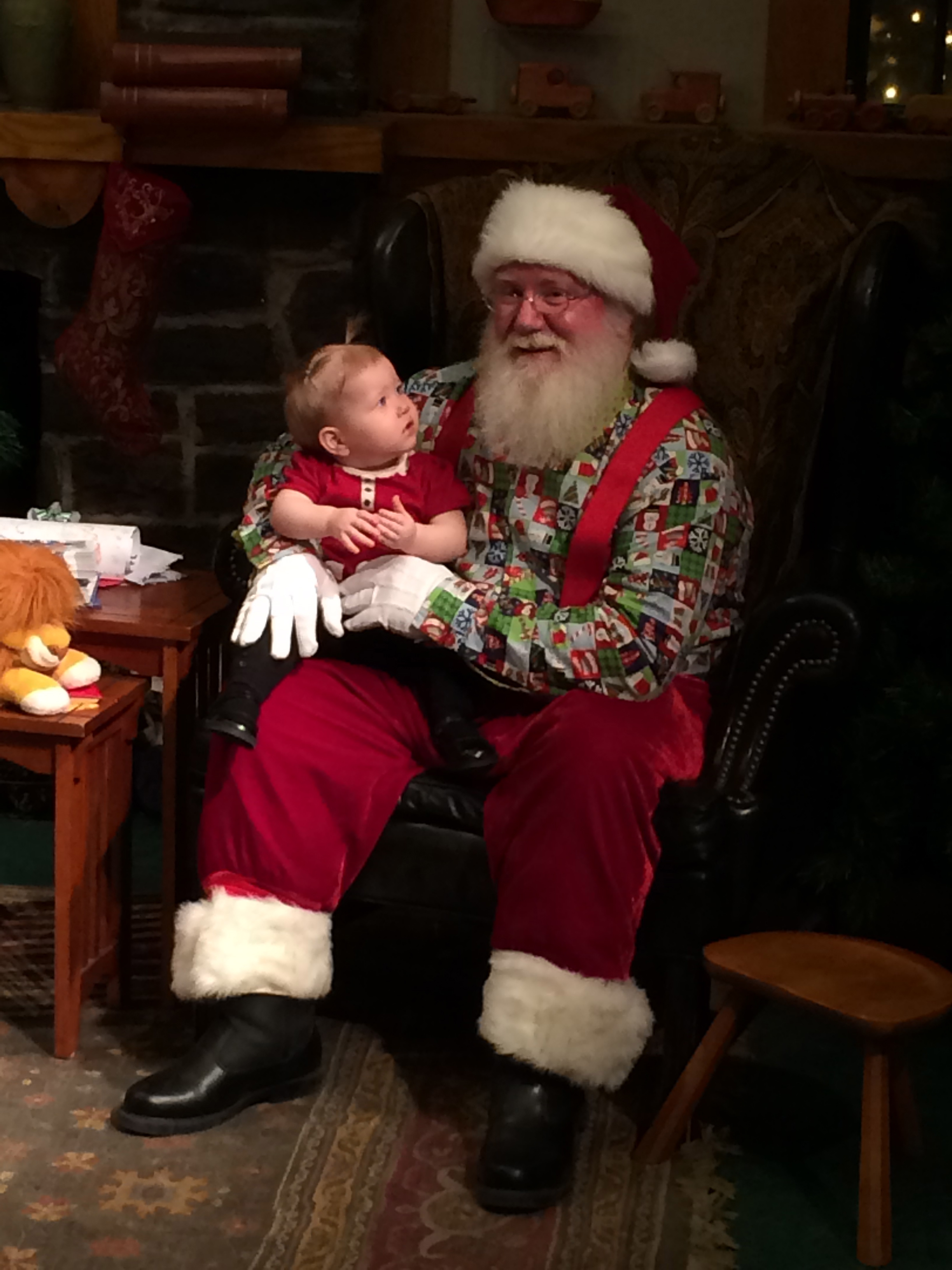 We took you to see Santa for the first time. I tried to plan the visit so we wouldn’t have to wait in line very long, but failed. Luckily, you and Daddy were stuck in traffic while I waited, so you only had to wait twenty minutes. I wasn’t sure how you would react as you usually take awhile to warm up to new people and places, but you did surprisingly well. You didn’t cry or smile. You pretty much just sat there and looked at him were intrigued by the items on the table next to him.