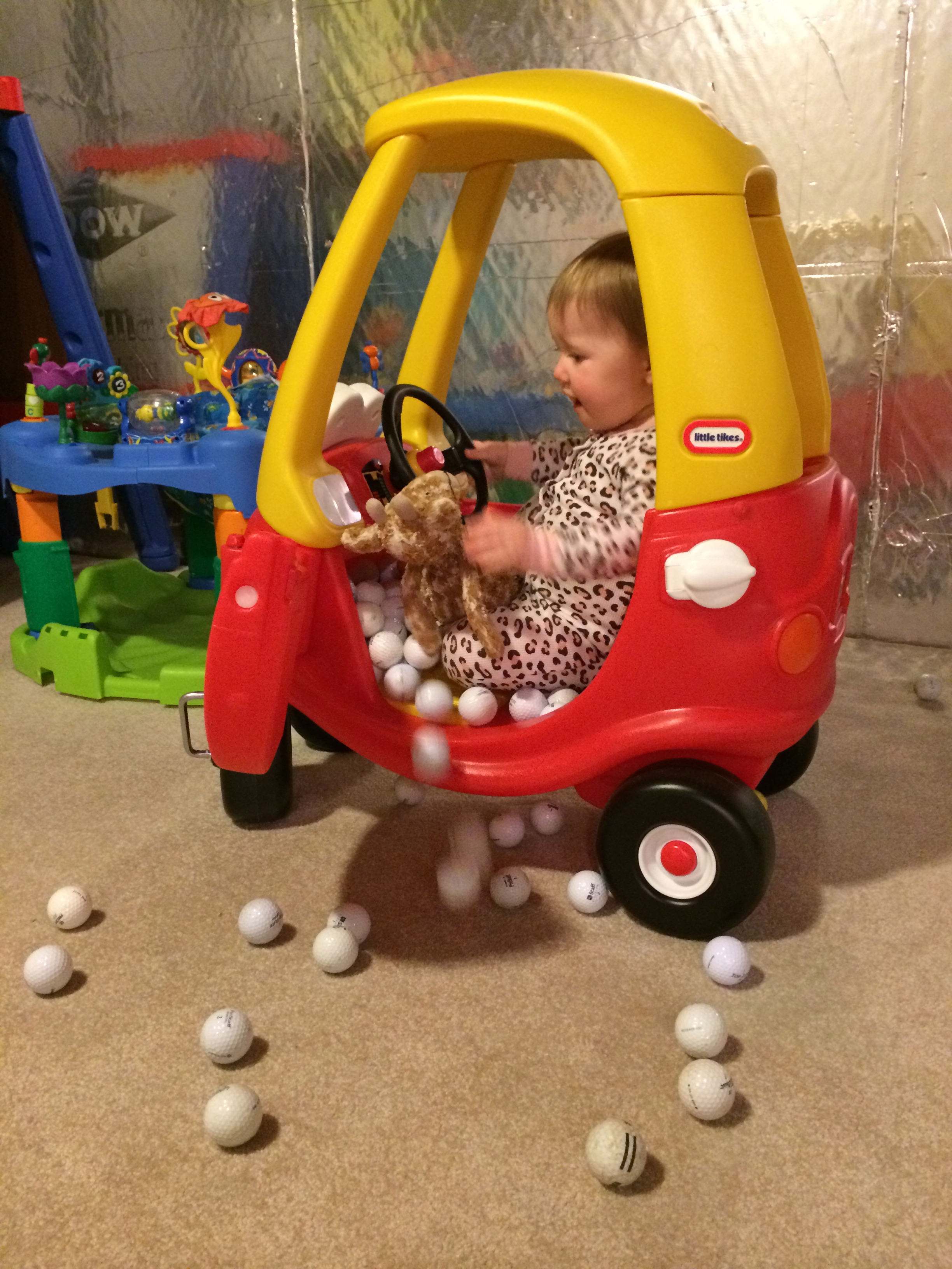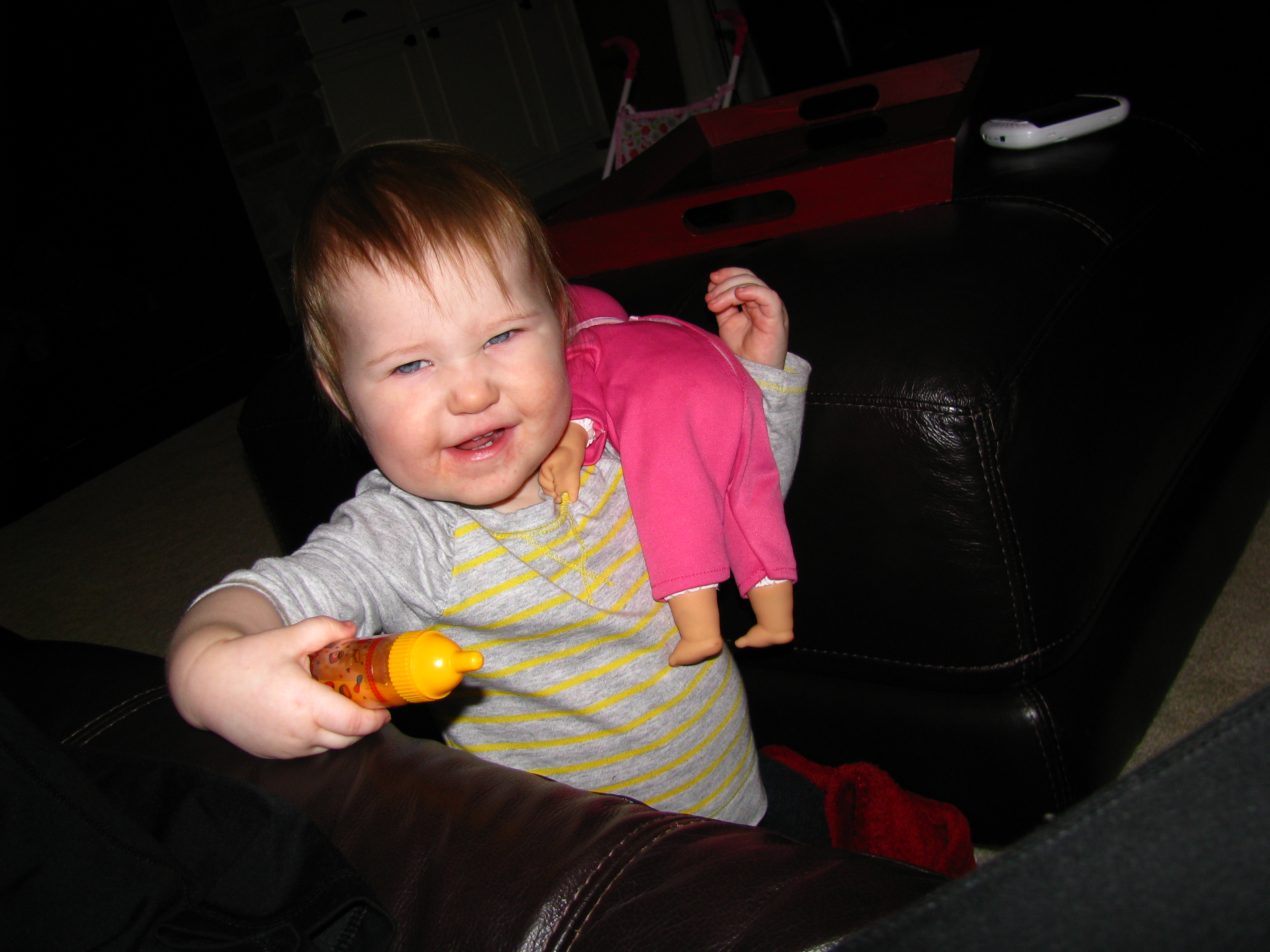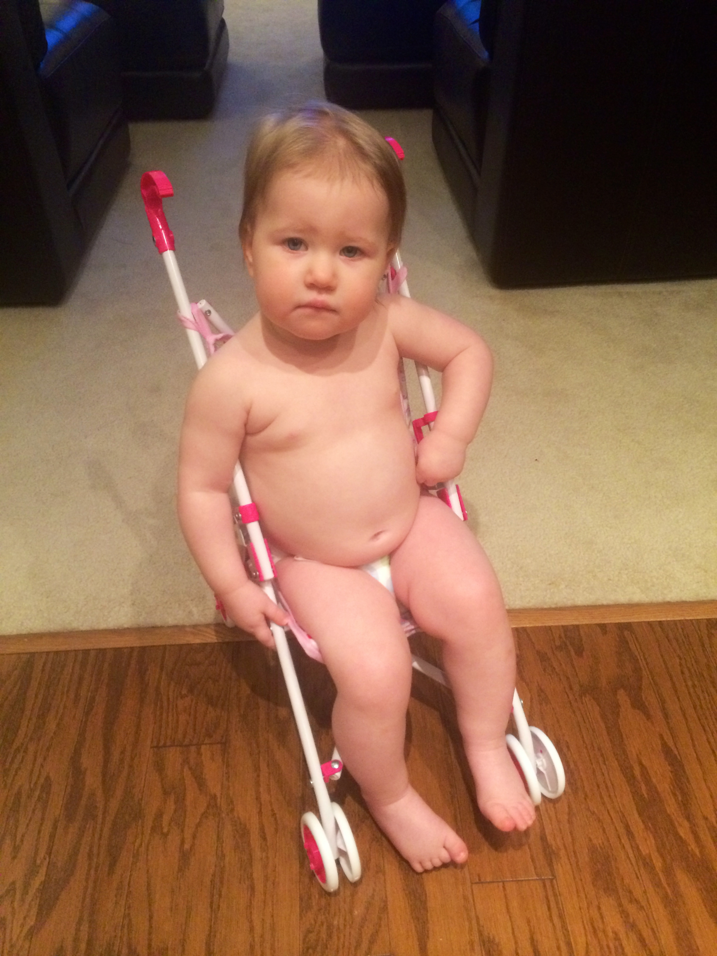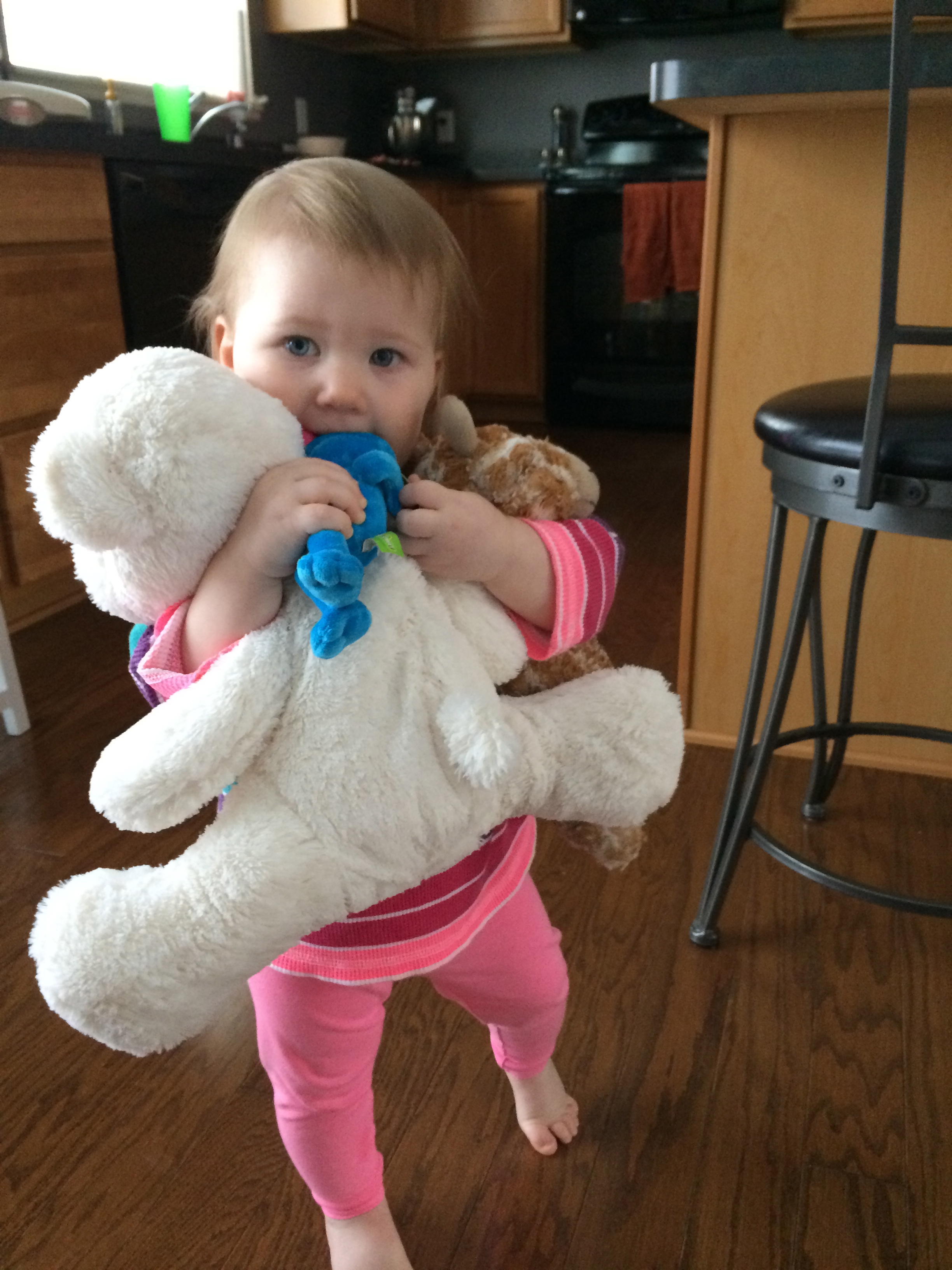 You’ve become a stuffed animal hoarder! You demand to have as many stuffed animals as you can hold in your little arms whenever leaving your crib. We’ll come into your room and you quickly start gathering as many of your friends as you can fit into your arms, look at us and say ‘up’. In the rare instance you’re distracted upon leaving, you will hold our hands bringing us to your room point to your crib and sign ‘please’ while point to your animals. You are only satisfied if your arms are full.