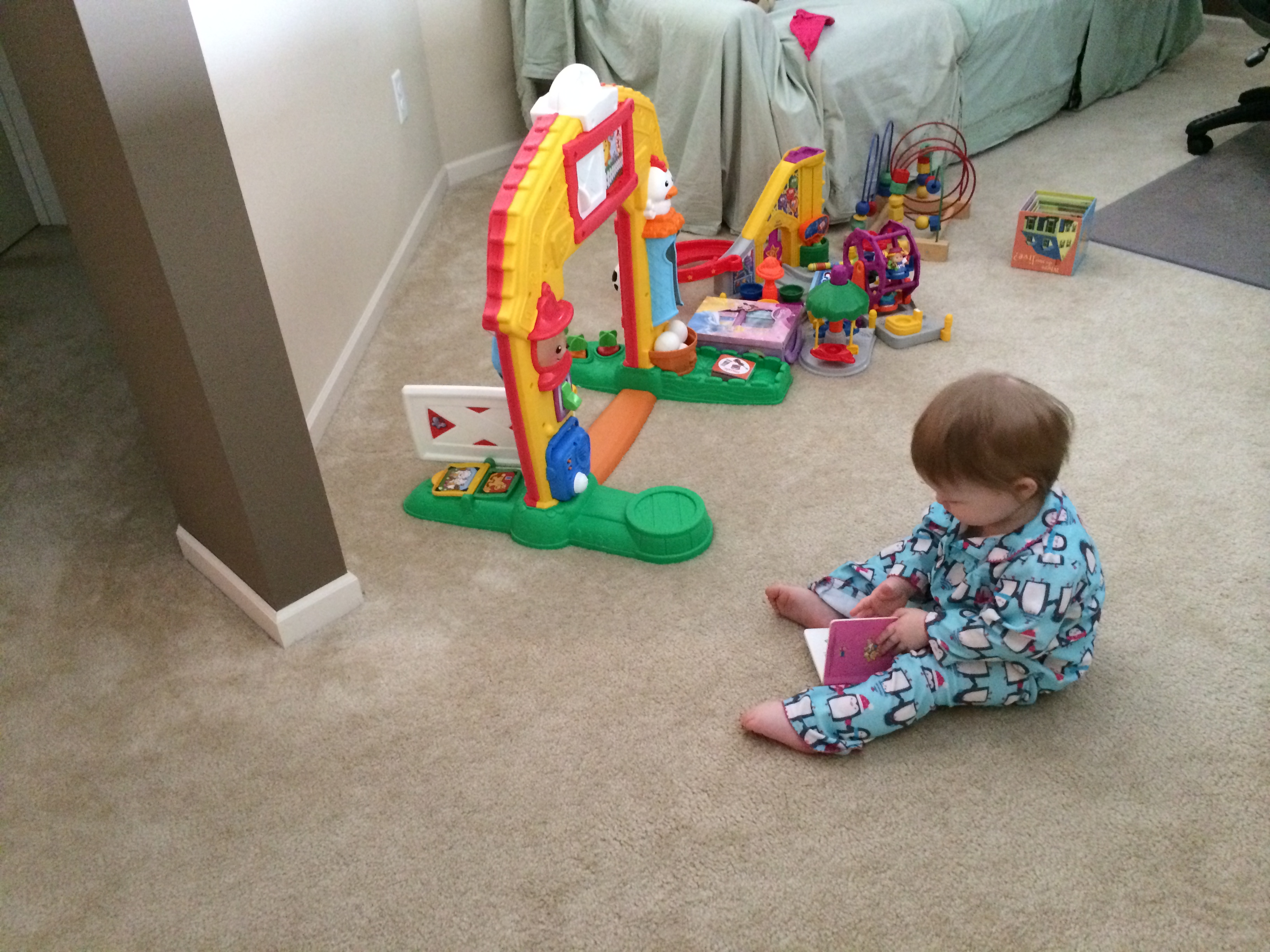 You’ve started watching shows on the ipad. You’re very favorite is Choo Choo Bobs, but have also watched Sesame Street, Barney, Thomas the Train and Baby Einstein. Interestingly, you’ll only watch these on the ipad—not the TV. I think the TV is up too high and too far away to keep you engaged.