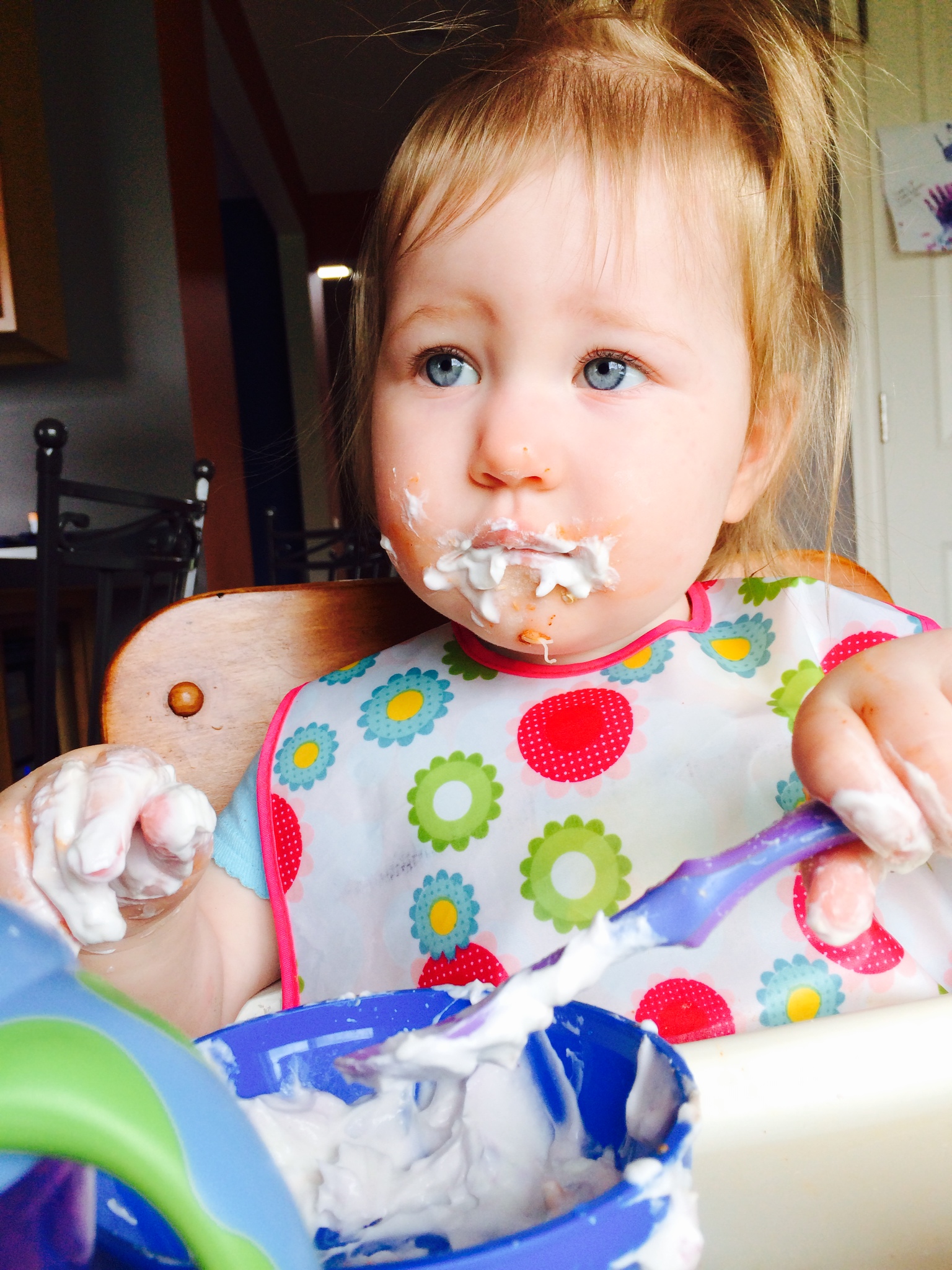 You use a spoon or fork at every meal. You’re successful about 50% of the time of getting food on the utensil and into your mouth, but eventually resort to using your fingers (while holding the fork in the other hand). Yogurt tends to be a messy one.
