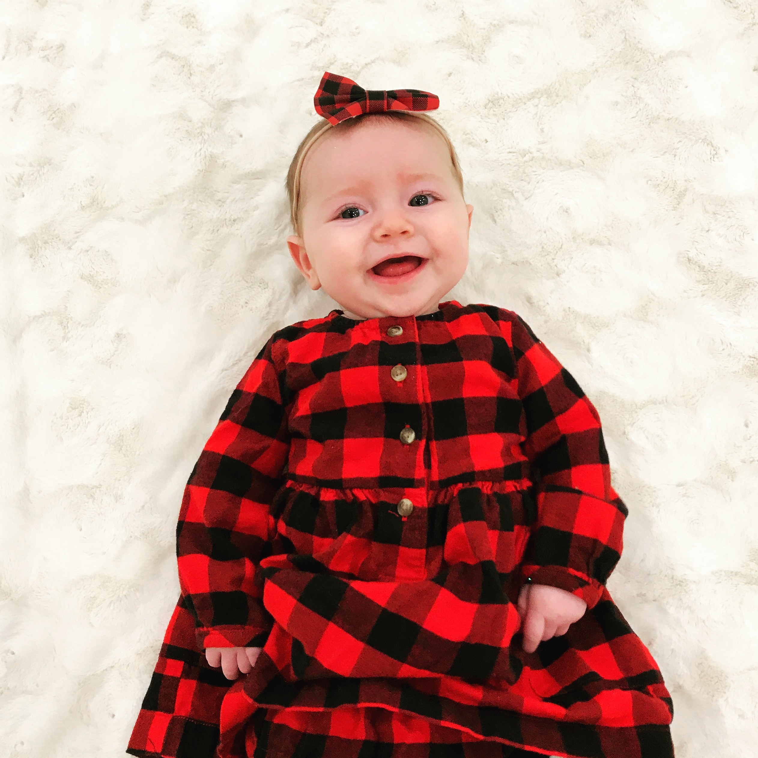 Most nights you sleep about 10 hours straight each night (7:30pm – 5:00pm). The first time you wake up, I’ll pop your pacifier back in and you’ll sleep for another 30-60 minutes. The second time you wake up, you’ll usually be happy and chatty as a bird. As soon as I enter, you quiet down and light up with a huge smile and squinty eyes once you see my face. You’re still not rolling over from back to front so we’ve continued to swaddle you. For bedtime, you’ll nurse and then I’ll swaddle you up, turn off the lights, put a blanket next to your face and snuggle with you in the rocking chair and you’re out in less than 5 minutes. If I’m in the middle of putting the big kids to bed, I’ll just put you down awake in your crib and you fall asleep, without a peep. Naps range from 2-3 a day and anywhere from 20 min to 2+ hours, in your crib swaddled in a muslin blanket.