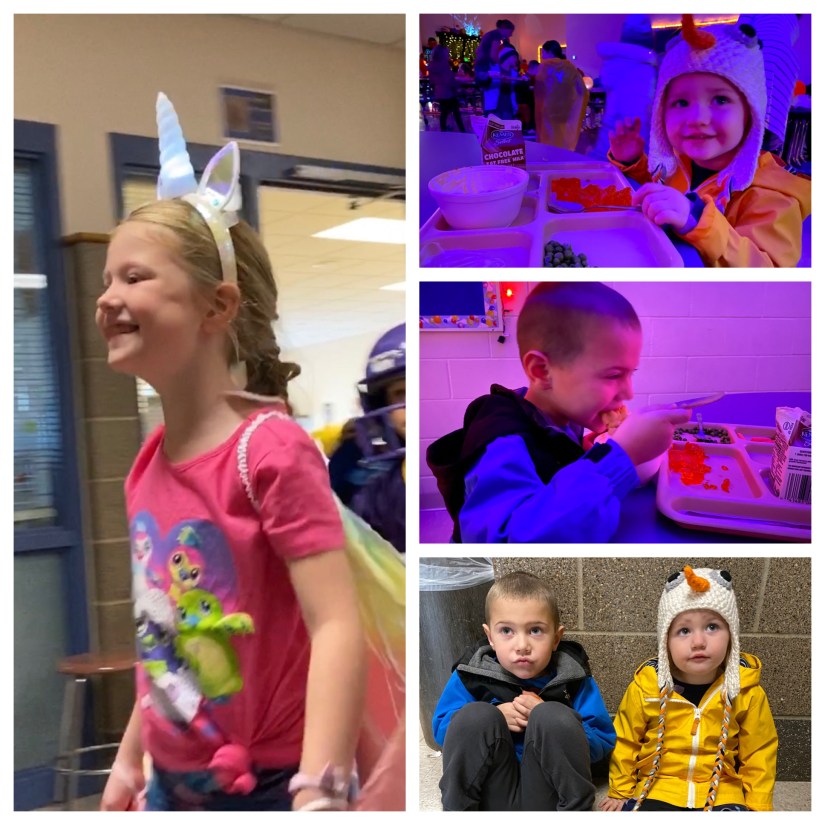 Then, Lexi also had a spooky lunch where the school decorates the cafeteria in spooky decor and has a spooky themed food. All the lights are turned off, black lights are on and Halloween decor is hanging. The meal had things like grapes in whip cream as googlly eyeballs and chicken fingers as grave stones. Parents are invited to join their kids for lunch and everyone gets a good kick out of it.