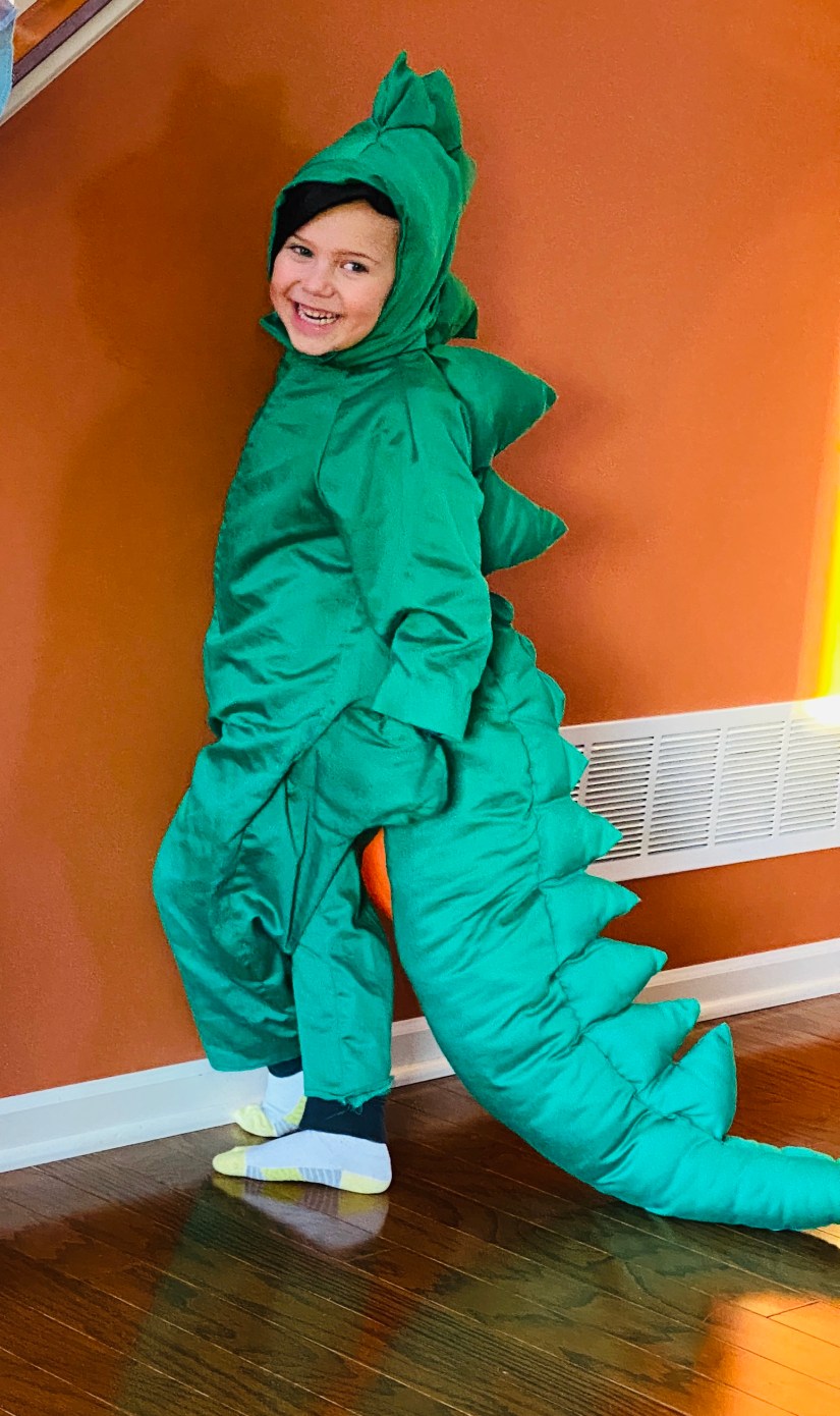 William: Dinosaur (same costume as last year, which barely fit–but was perfect as he loves green and dinosaurs)
