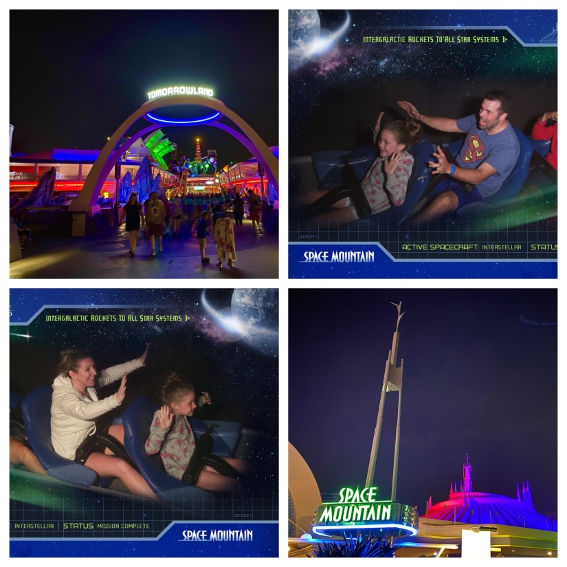 Daddy and Lexi headed over to Space Mountain while Mommy, Kate and William went on Winnie the Pooh–another favorite ride. After the ride was over, I knew we had pushed as far as we could with the two littles. They were tired and crabby. We grabbed some ice cream as we walked over to space mountain to wait for Daddy and Lexi. We did a quick rider switch and Lexi got to go on Space Mountain again with Mommy. Although the ride was pretty fun. I was fairly nervous for my Lexi. We were going pretty fast, couldn’t see anything and I was worried about her head bobbling around to much and getting some whip lash.
