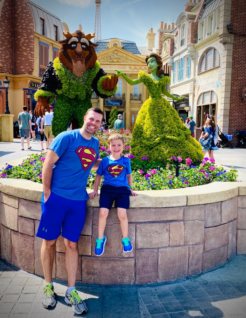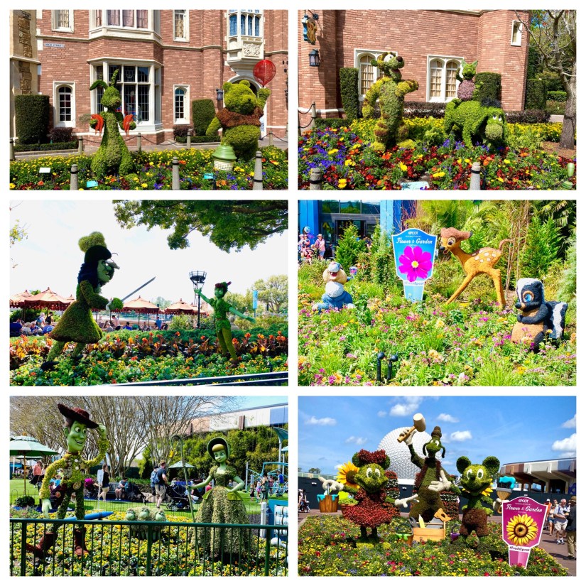 By the time we got through the line to meet Anna and Elsa, the Frozen ride was back up and running and we used our 11:00 FastPass to jump through the lines. This ride is super cute and low key and I loved that our whole family could sit in one row of the boat. When we were done with the frozen ride at about 11:30, and the world showcase was starting to open so we began our journey to very quickly skim the world. You kids did not have the patience for mom and dad to fully enjoy it. It also happened to be the first day of the Flower and Garden Festival so we spent time looking at all the amazing topiaries, which I adored. They smelled amazing and it was fascinating to see how they created characters from different kinds of flowers.