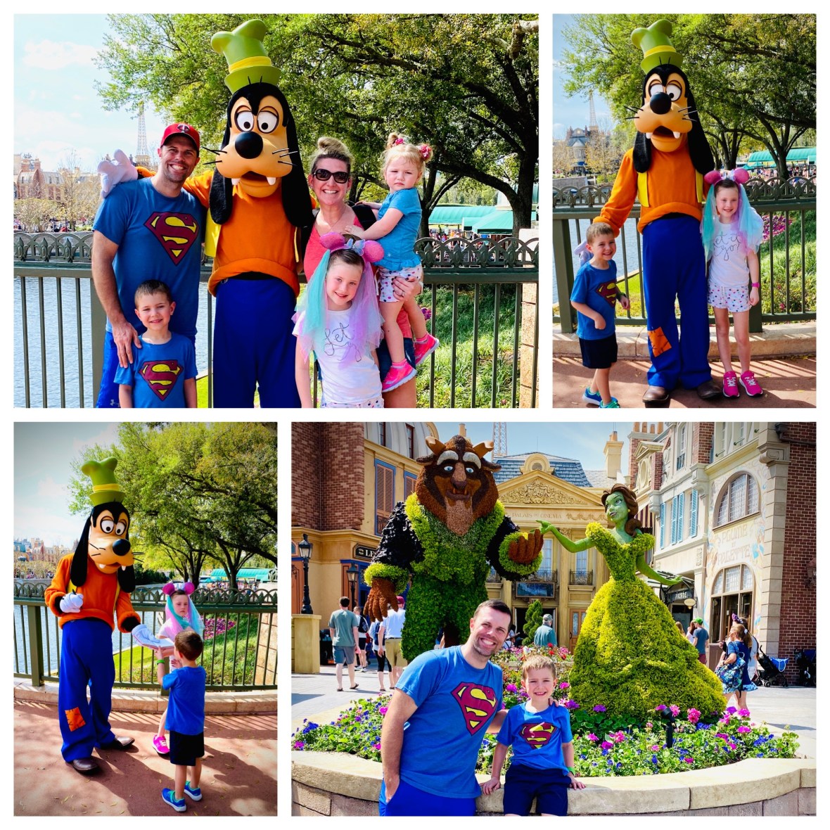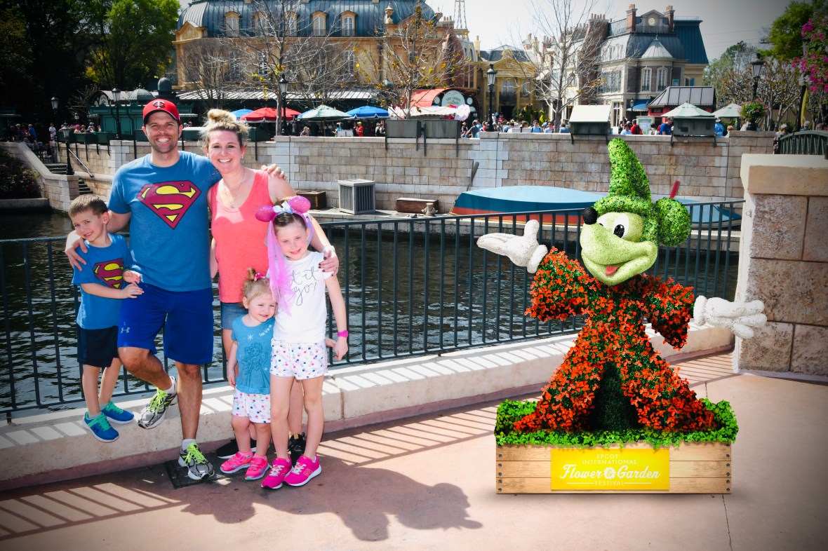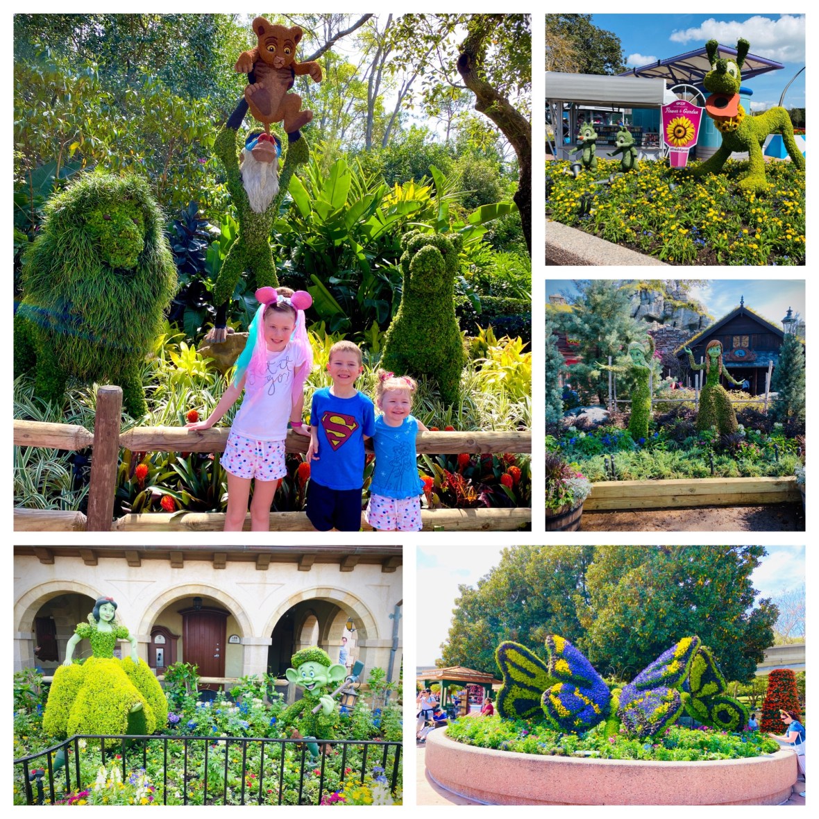 By the time we got through the line to meet Anna and Elsa, the Frozen ride was back up and running and we used our 11:00 FastPass to jump through the lines. This ride is super cute and low key and I loved that our whole family could sit in one row of the boat. When we were done with the frozen ride at about 11:30, and the world showcase was starting to open so we began our journey to very quickly skim the world. You kids did not have the patience for mom and dad to fully enjoy it. It also happened to be the first day of the Flower and Garden Festival so we spent time looking at all the amazing topiaries, which I adored. They smelled amazing and it was fascinating to see how they created characters from different kinds of flowers.