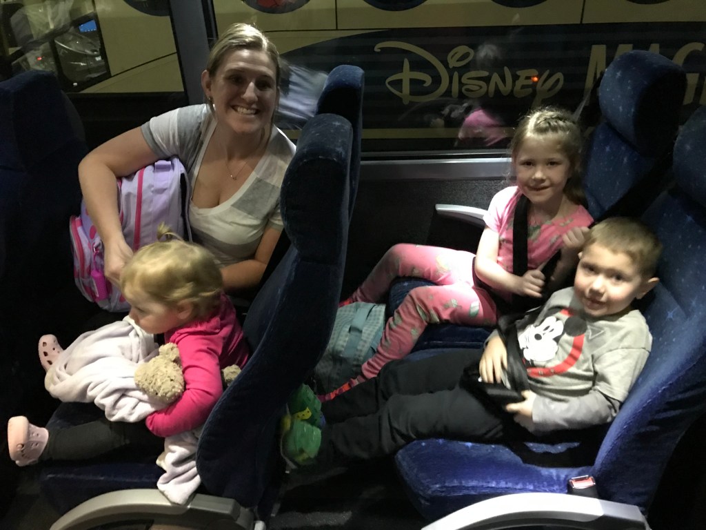 Today started bright and early for all of us. Daddy and I woke up around 5:30 am to get ready, and pack the car before we woke you kiddos up around 6. Daddy brought all of our stuff to the car, we quickly got changed and headed down to get in the bus line around 6:30 am. The first bus was supposed to start to pick up people around 7, but it arrived around 6:45 and we arrived to Animal Kingdom around 7.
